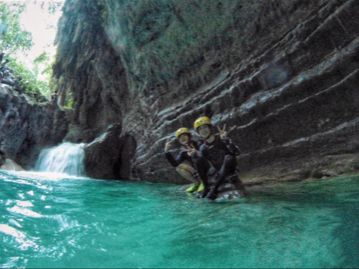 キャニオニングの場所までは車で登り、いざスタートです。山道を登り、川にたどり着きますが、川の水はちょうどよく冷たくて気持ちよいです。沢を下ったり、泳いだり、流されたり、天然のスライダーを滑り落ちたりと爽快で楽しい経験が3時間ほどできます。特に、水への飛び込みは、最初は怖いのですが、やってみると病みつきになります。まずは、2m~7mくらいの飛び込みが続きます。これをこなしていくうちに慣れてきて、その後の高い飛び込みもできる様になっていくと思います。最後の14m、12mのジャンプをし終わったときは、何か人生吹っ切れた気さえして、とても良い経験になりました。