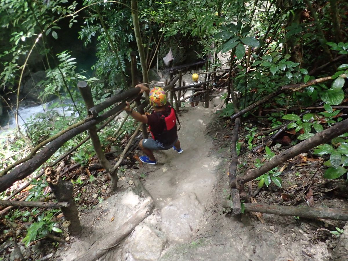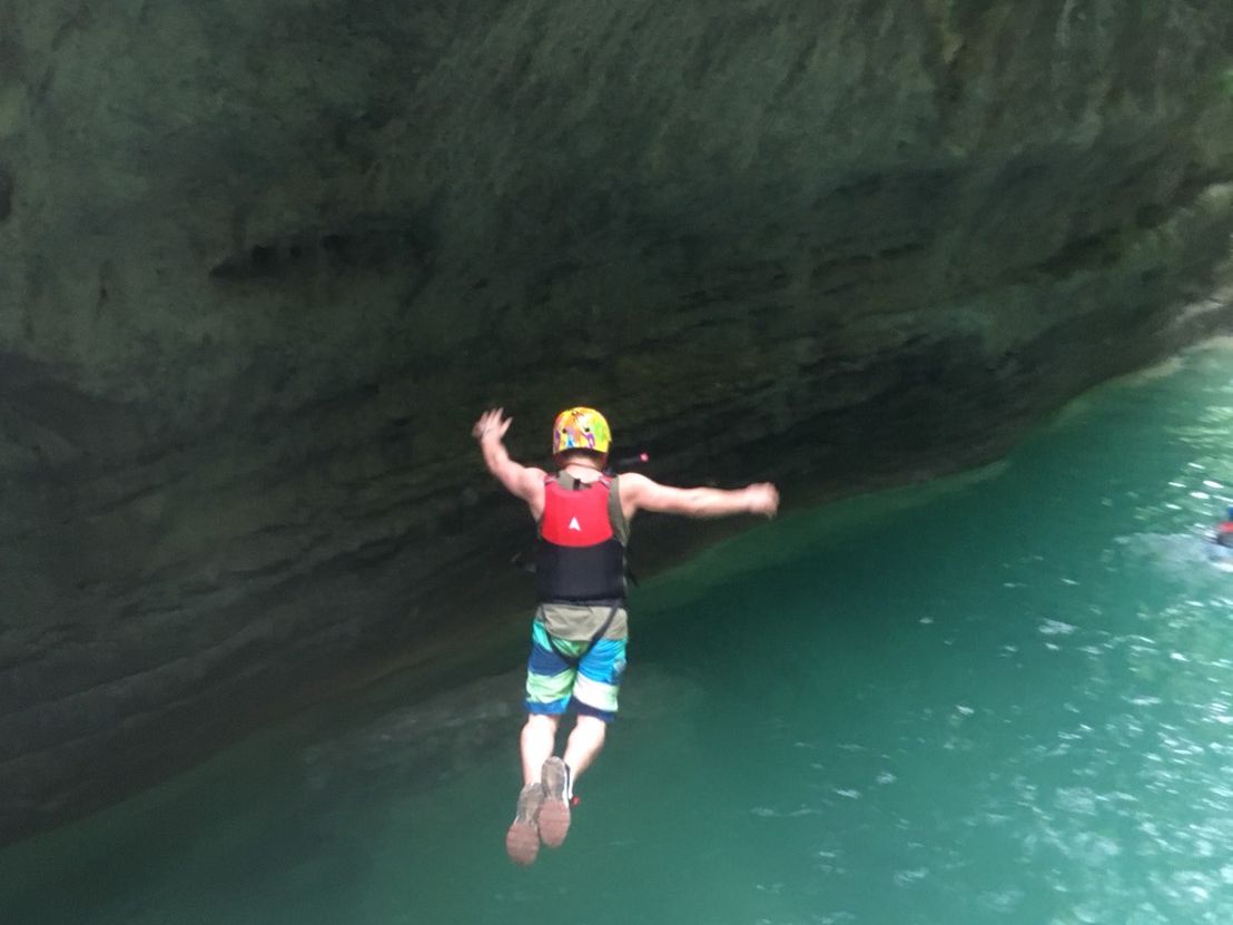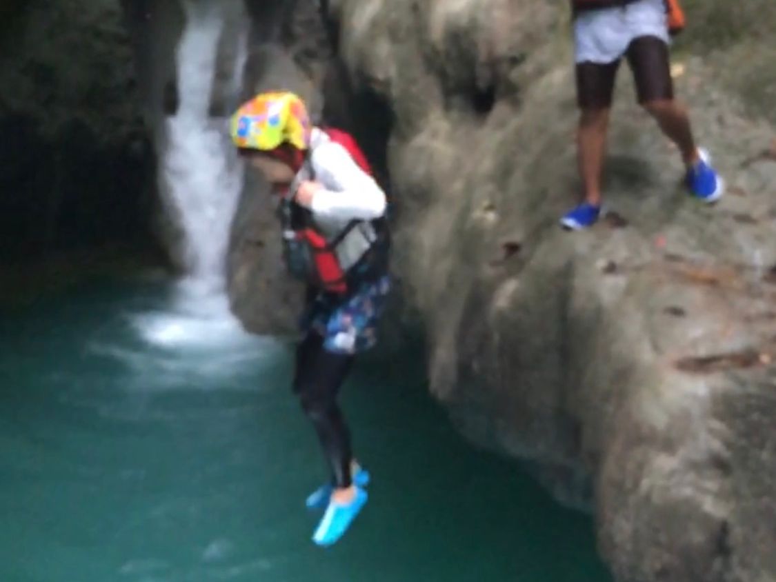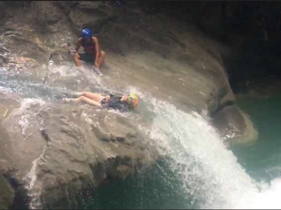 20分ぐらい山道を歩くと川に到着します。しょっぱなから7mの崖をジャンプして川に飛び込みです!!歩いて暑かったので川の水の気持ちいいこと。ここからひたすら川を下ります。この川を知り尽くしたガイドさんが岩が出ていて危ないところを教えてくれたり岩と岩の間をジャンプしたり下ったりする時に手を貸してくれて本当に親切です。また防水じゃない私の携帯をわざわざ防水バッグから出したりしまったりを繰り返して沢山の写真を撮ってくれました。面倒にも関わらずホントにホントに感謝です。