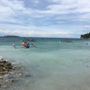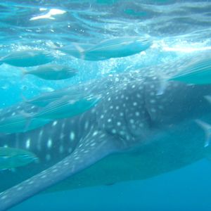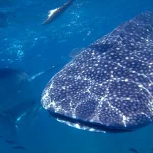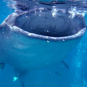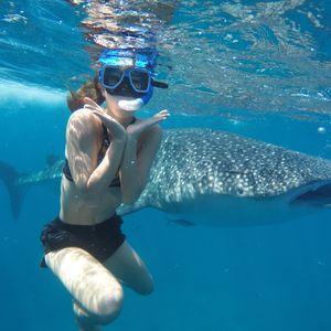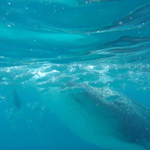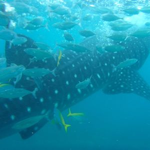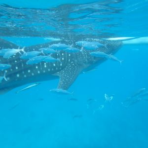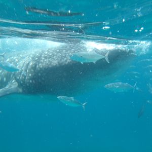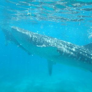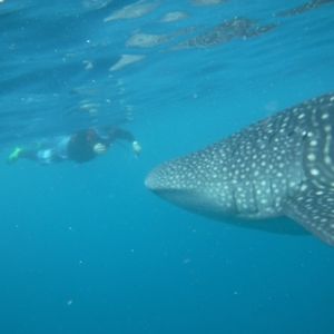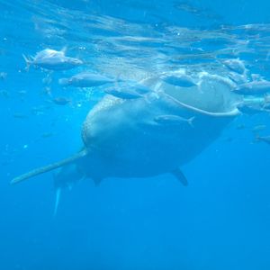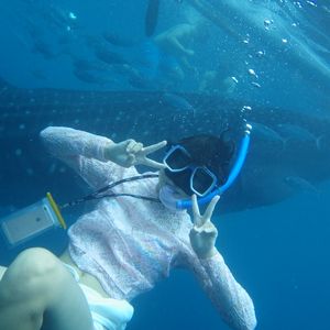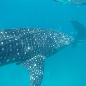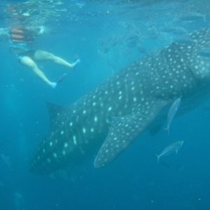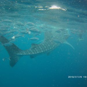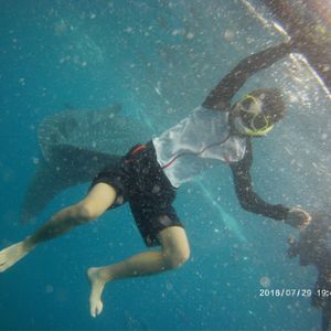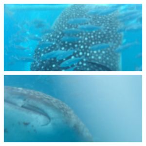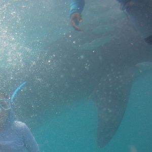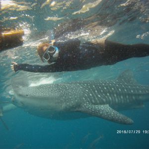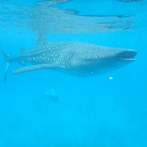 11/26に、このジンベイザメのツアーに参加しました。ホテルからオスロブまでに道のりは過酷で道はあまり綺麗ではなく、ガタガタの道を4時間くらい走りました。車内の中はみんな色々な寝方で、以外に車の中のみんなの寝姿もおもしろかったです。向かう最中にびっくりした事がありました。それは 1回目の休憩で、トイレが有料だった事です。びっくりして、あまり出ませんでした。笑 そんな感じで目的地に到着して、次にびっくりしたのが、人の多さです。海と浜辺の間にかなりの人がいて、歩く場所もないことにびっくりしました。最終目的のジンベイザメと写真が撮れて大満足でした。しかし、事件が起こったのです。自分たちが持ってきたカメラ(ゴープロ)が海の底に沈んだのです。僕の彼女はとても落ち込んでいたのですが、現地のスタッフが一生懸命潜りゴープロを探してくれました。しかし、深水は深く、エアーなしで潜ることは不可能となり、ひとりの現地のスタッフが近寄ってき「僕のお友達がダイビングして、見つけてあげるから安心して」と言ってくれました。サメとの時間も終わり、船からあがったと同時にダイビングの方が帰ってきました。その手には、ゴープロがあったのです。内心、半ばあきらめていましたが、無事見つける事ができて、感謝感激な旅でした。また行きたいと思います!ありがとうございました