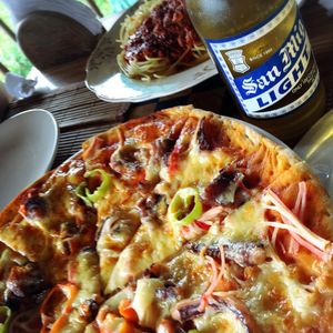 ピザなどをつまみながら海の眺望を眺めるのは何とも贅沢な時間ですね。