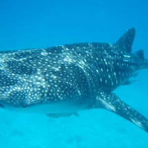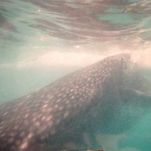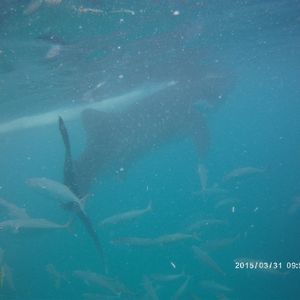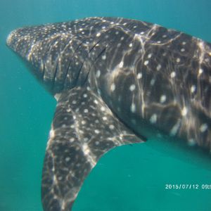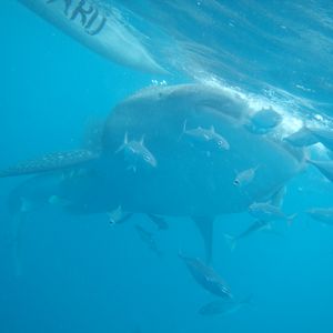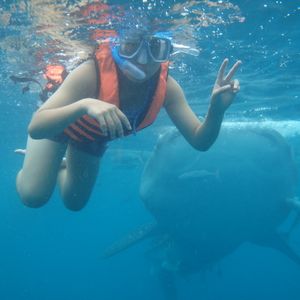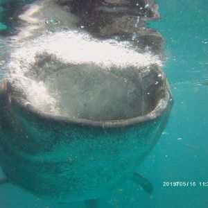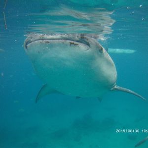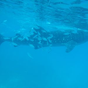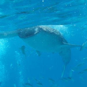 海に入り、現地スタッフの合図に従って潜るとすぐに目と鼻の先にジンベイザメを見ることができました。水中カメラも550ペソでレンタルでき、現地スタッフが150枚も撮ってくれました。丁度ジンベイザメが近くに来た際に合図をくれますし、良い写真が撮れるよういろいろと動いて頂けてとても良かったです。泳げなくてもライフジャケットがあるので大丈夫です。