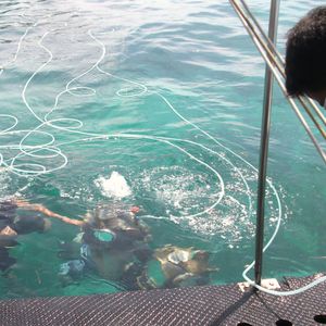 この日は、平日だったせいか、2人で貸切でした!一緒に泳いでくれる方は、とても明るくて気さくな人で、船長をふくめ5人の方がいました。写真もたくさん撮ってくれたり、船で1時間かけて行く間もとても楽しくいけました。また、割と大きな船なので船酔いはしないです!また、シュノーケリングは1時間ぐらいできます。ロープで囲まれたエリアを泳ぐという感じです。ゴープロを持ってったのですが、ムービーを撮ってくれたりととても手厚いサポートをしてくれました!!!ナルスワン島には上陸しないのですが、船の先に座って写真を撮ってくれたり、写真を満足するまで撮ってからの出発をしてくれて、船長さんは優しかったです!しかし、船なのでトイレはあまり良くないです!女性の方は、済ませて行くのがベストです!海は、サンゴがあるから魚はいるという感じで、あまり透明ではなく、水草もたくさん浮いてました!
