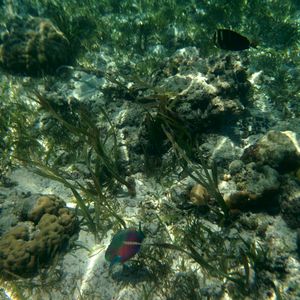 しかし、そんな天気でもシュノーケリングでは海底まで水は透き通っていて、魚も豊富。簡単な餌もくれるので周りを、魚に囲まれることも出来、非常に楽しめた。