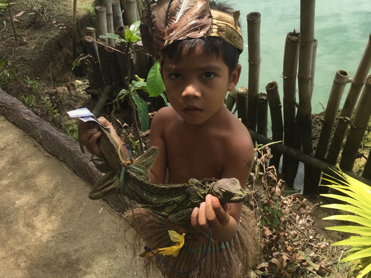 川下りの折り返し地点では、原住民の暮らしを再現した村に降り、陽気なリズムが繰り出される中、交流することができます。勧められるがままに、リズムに乗りながら一緒に写真を撮っていると、いきなり火を口から噴出され圧巻し、その瞬間を写真に収めてくれました。