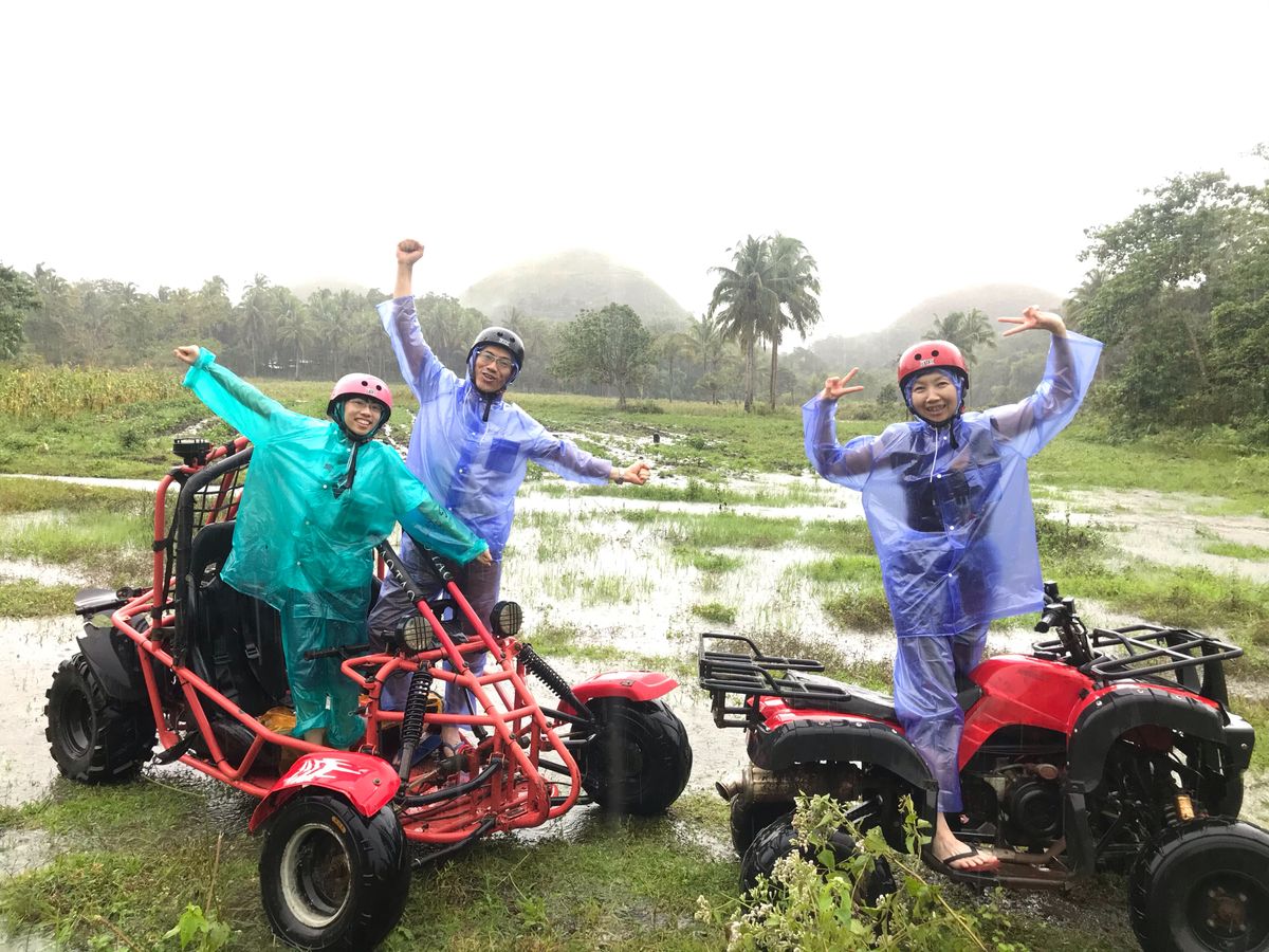 ・バギーは先導してくれる現地スタッフがあえて悪路を選ぶので、その道を突っ切るイメージです。1人用と2人用があります。この日は天気が悪かったのですが、バギーをしているときにちょうど晴れてきて、チョコレートヒルズ(と言ってもこの時期は緑色ですが)がすごく綺麗に見え、その地点でスタッフに写真も撮ってもらえました。泥が飛んでくるので、カッパは絶対借りたほうがいいです。