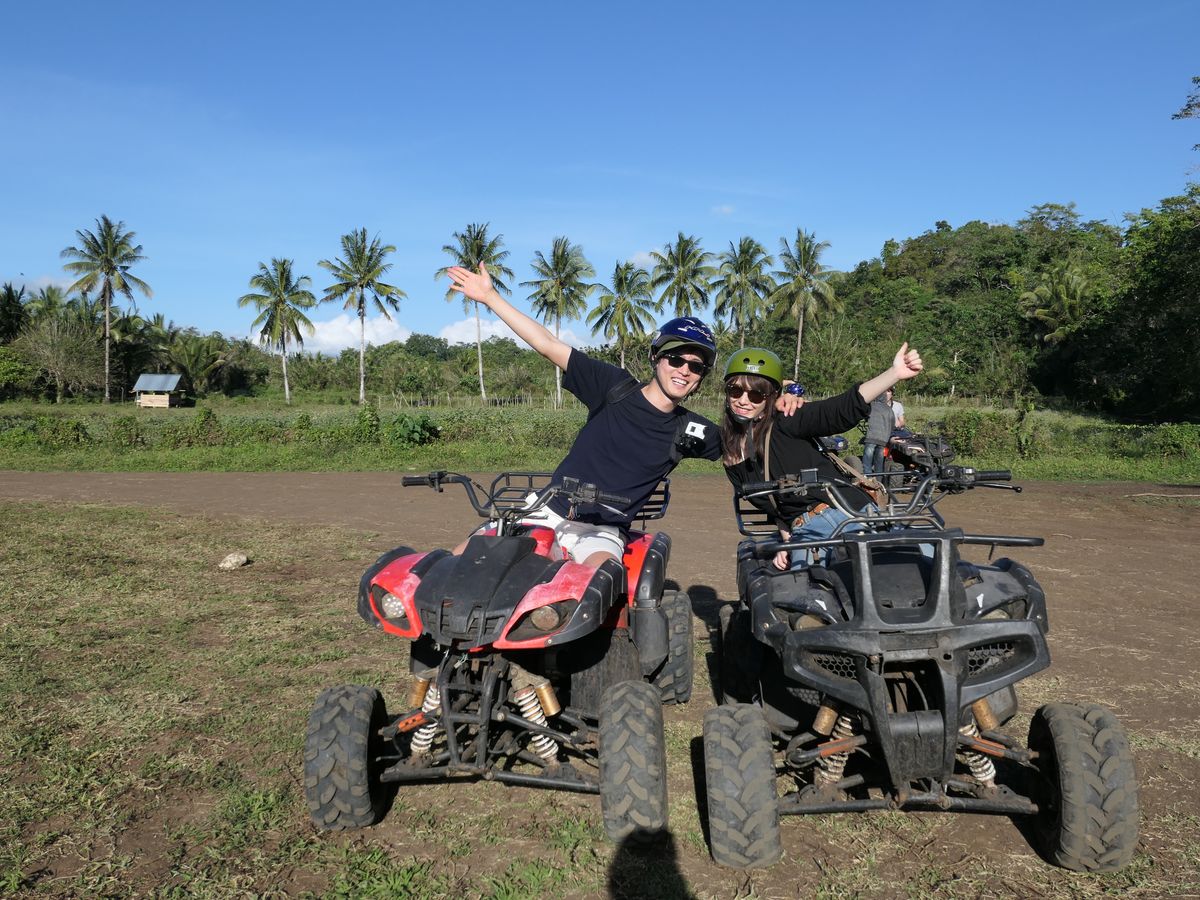 不安いっぱいの中、船に乗り込みます。この船への乗り込み方もフィリピンならではでなかなか楽しめました。結局、12時45分、船は無事出発することができ、ツアー継続決定です。2時30分ごろボホール島に到着。素朴さが伺える、イメージ通りの島でした。車で移動すること45分。ターシャ園へ。正直、夜行性で寝ているだろうし、ゆうても小さいサルでしょう、と思っていましたが実際みたら気づきました。可愛いと。これは実物を見る価値ありです。写真の数千倍愛くるしいです。ターシャで癒された後はチョコレートヒルズへ。また45分移動です。船で時間を一時間ロスした我々にはバギーは30分のみの選択肢です。まずはチョコレートヒルズ下にあるオートバギー乗り場へ。幸いツアー参加者全員参加だったので連なってGO!ただすぐにブレーキが壊れてることが判明。違うバギーに乗り換えに。このバギーもしばらくするとエンジントラブルに。3台目にして運命の一台に出会えました。しばらく先導してくれる現地スタッフについていくと、途中バギーをとめての撮影会に突入。トリック写真や普段ならばやらないであろうポーズを指定され次々とられていきます。バギー15分、撮影会15分、のような感じでしたが良い旅の思い出ができ、バギー乗車はぜひ体験してみてほしいです。その後、ヒルズの展望台にのぼります。こちらも一度経験しておいて損のない景観です。ここからボート乗り場へ。こちらも移動は45分くらい。18時45分発のセブ行きを目指します。高速船?らしく1時間でセブに着く船です。アクシデントはありましたが、帰り時間は当初の予定と変わりなく、何を割愛するわけでもなく見事リプランをたててくださったガイドさんの手際の良さにはただただ脱帽です。