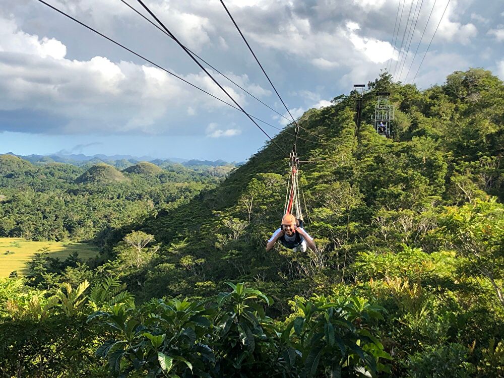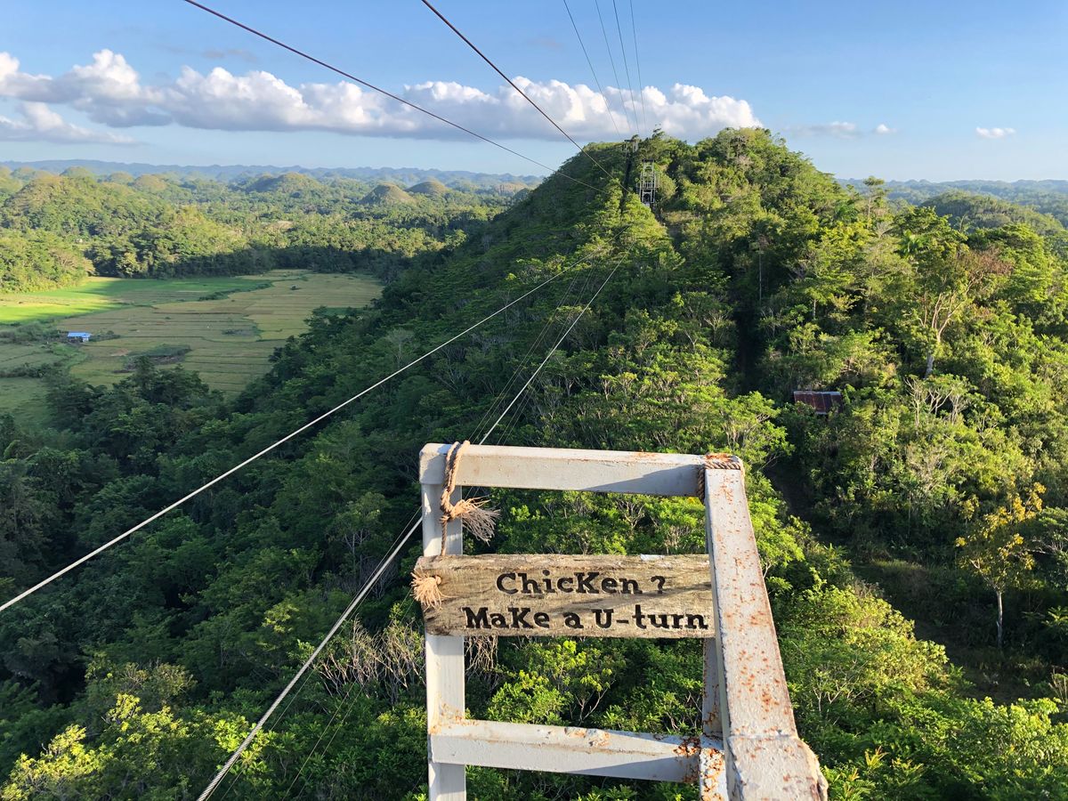 噂どおりの冷え冷え高速船に揺られること90分、到着してまずはおねむのメガネ猿ちゃんたちを取り囲み撮影ラッシュ。次にランチブュッフェを堪能しリバークルーズでは地元の子供達がバンブーダンスを披露してくれました。そしてメインイベントのジップラインに向かい小高い山を登ったら、さらに高い鉄塔を登ったさきには、チョコレートヒルズが見渡せる絶好な景色でしたが、あいにくの強風。なんと前のチャレンジャーが強風に煽られて恐怖の空中脱輪!係りのスタッフが綱渡りで救助中でした。そんな状況で僕らの恐怖体験は幕を開けるのでした。