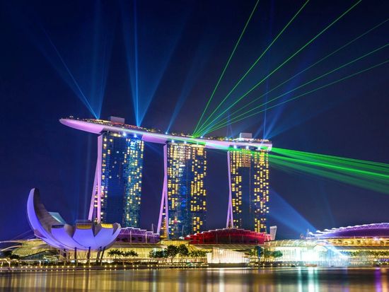 マリーナベイ・サンズ前で行われる光と音のショー「スペクトラ」をクルーズ上から鑑賞!噴水と光、音楽が融合した幻想的な演出が、シンガポールの夜を華やかに彩ります。