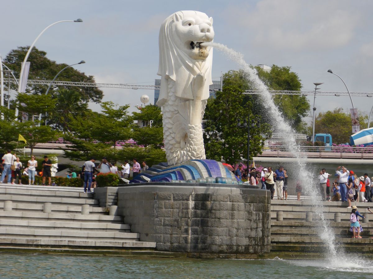 その後 川を船で下りマリーナベイサンズを見ながらその対岸へ。マーライオンは清掃工事の為囲われて何も見えず。(2019 5/6までとのこと)