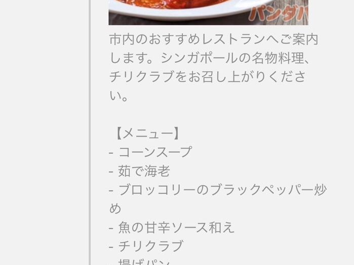 夕食のチリクラブは、とても美味しかった。また食べたいです。その後のクルーズ、オープントップバス、ガーデンなどは夜景がとても綺麗で写真好きには、持ってこいです。ただ、オープントップバスは多国籍人の乗り合いだった為、この時の説明は英語でした。
