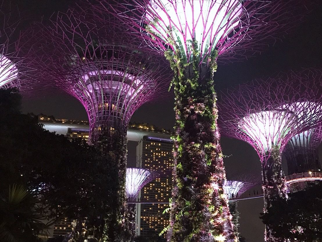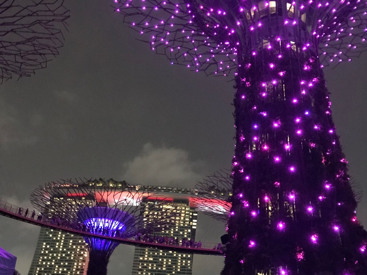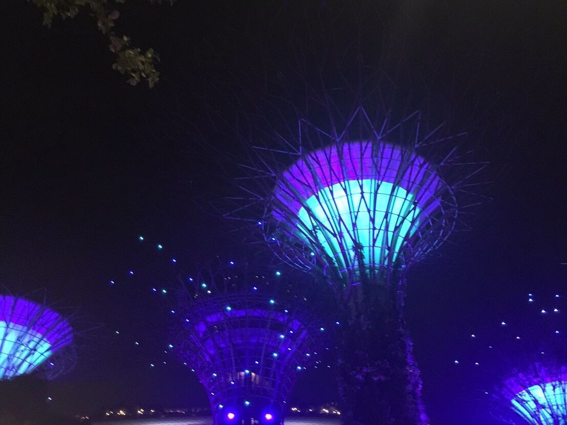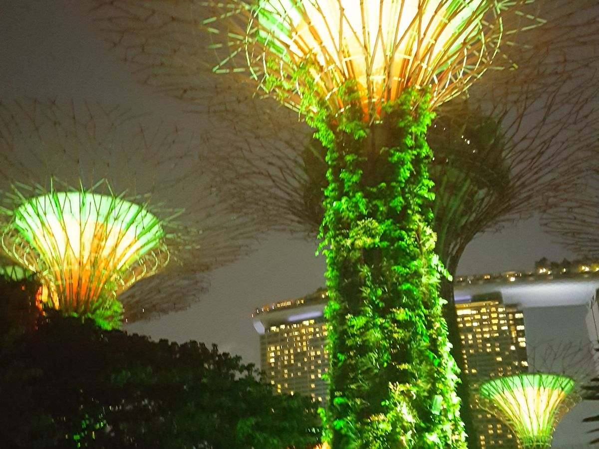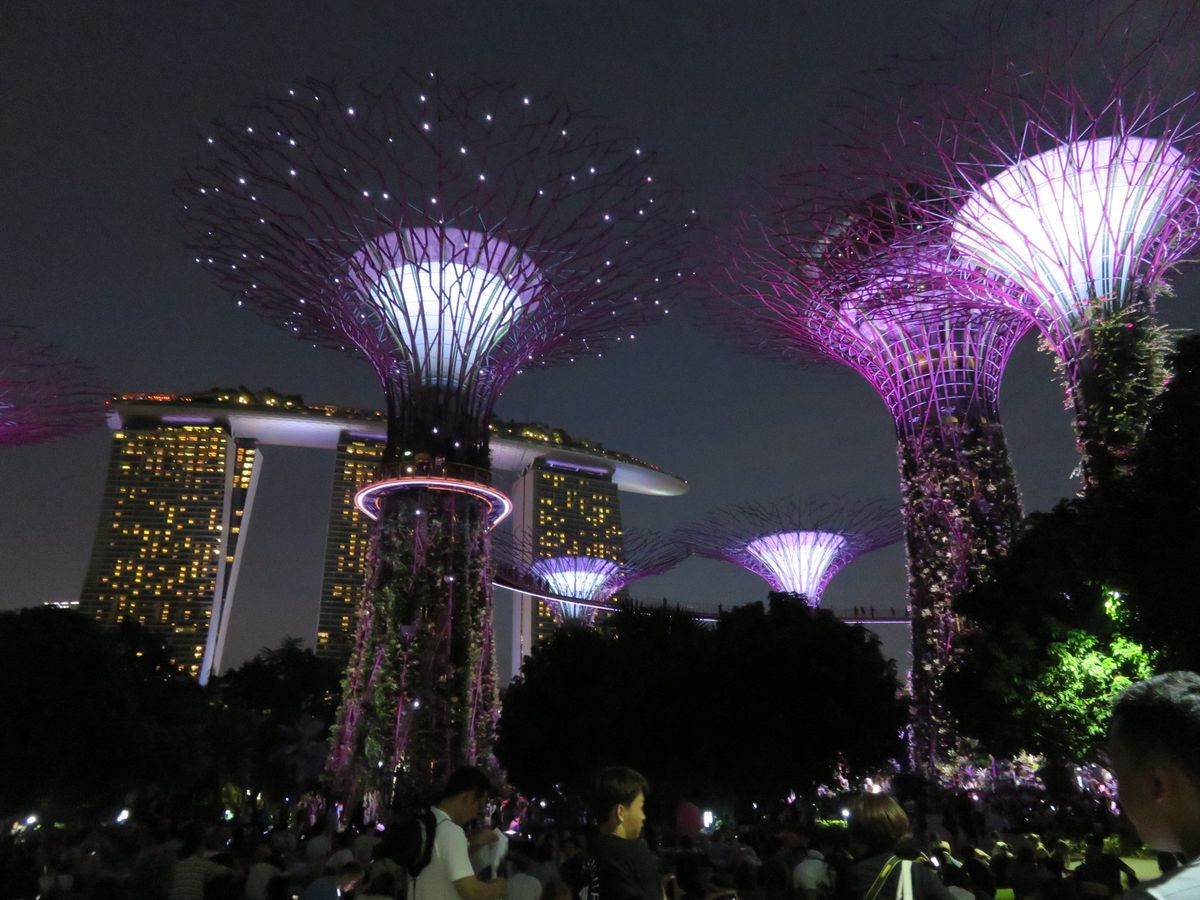 その後バスでガーデンバイザベイのナイトショーへ。あまり待つことなくショーが始まります。13分程光るツリーとマリーナベイサンズの高層ビルを楽しみましょう。