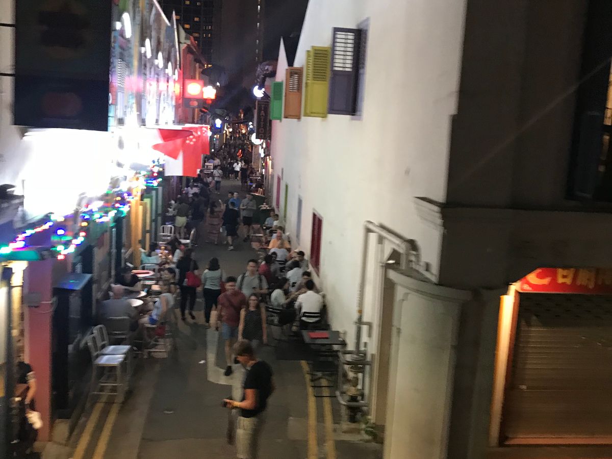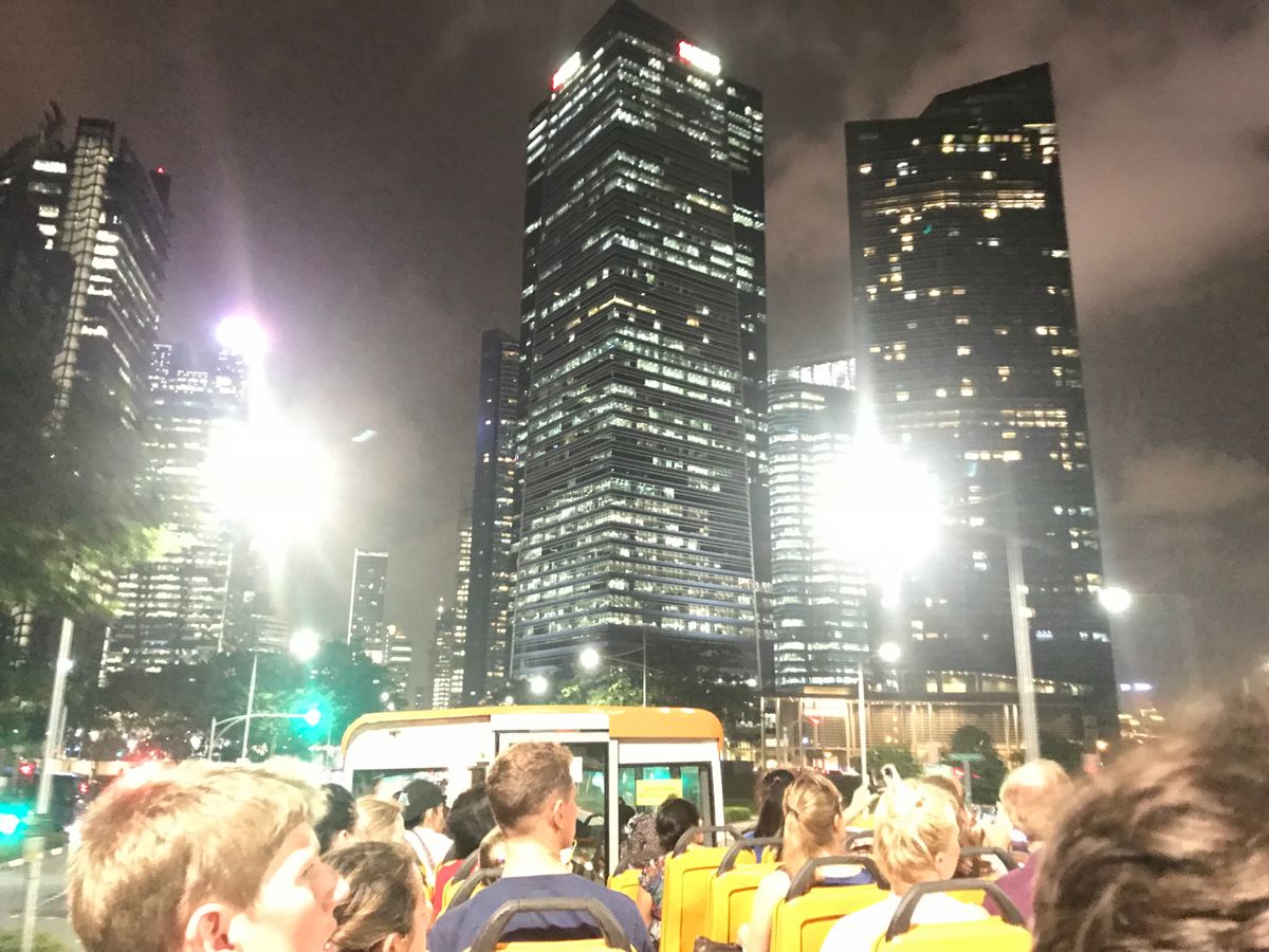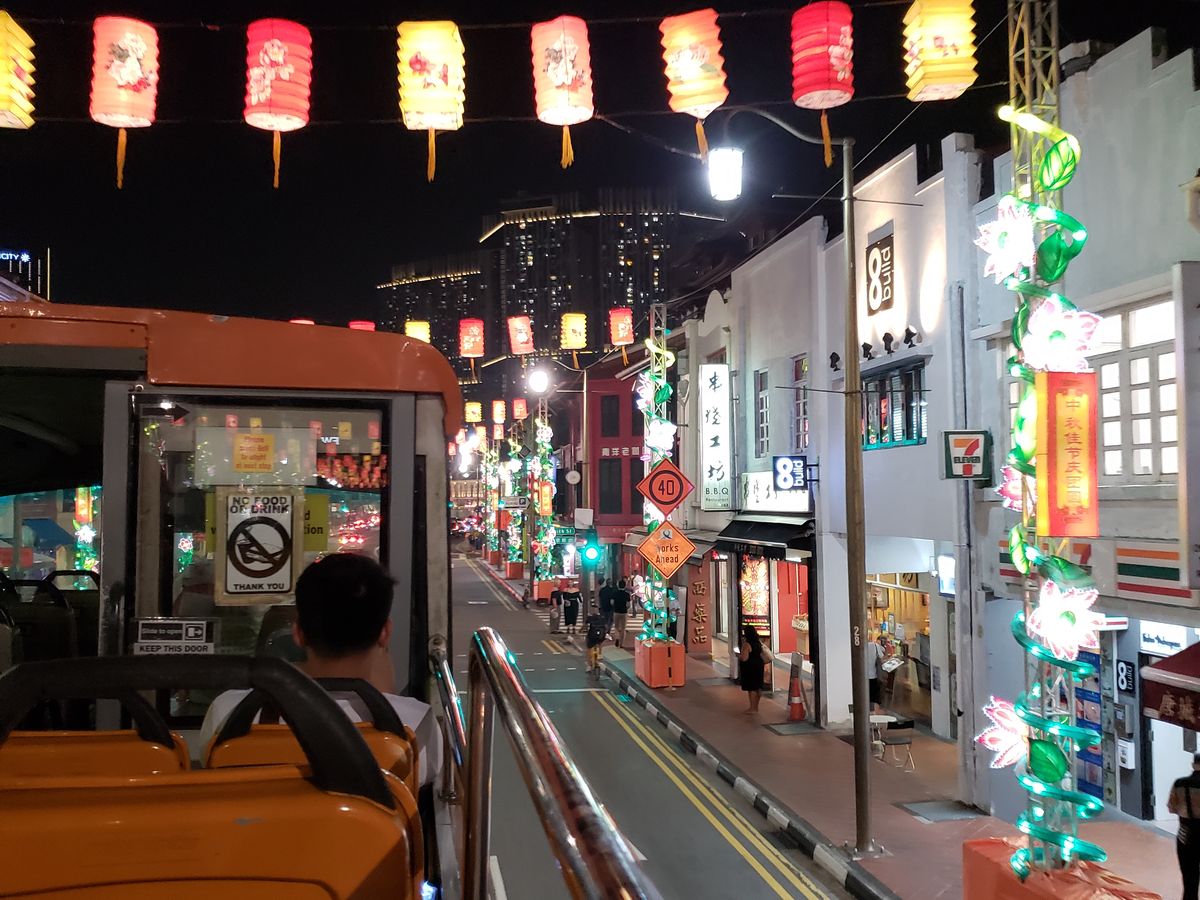 ショーが終わるとオープントップバスに乗車です。2Fの後方席がおススメです。バスのアナウンスが英語です。日本語で街並みの紹介と合わせて夜景を楽しみたい方は要検討かなと思いますが、もちろん夜景は楽しめます。途中ハジレーンというアラブ街で下車してストリートを歩きながら楽しんでもいいですし、そのままバスに乗っていてもOKです。ストリート下車組みも道の反対側まで歩いてきたらまたバスに乗り込みます。主にマリーナベイ、シティ、シティホール、ブギス、アラブ街を走り最後はクラークキーでオープントップバスは終了です。