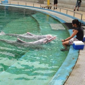 ショーに出るイルカは3匹いるうちの1匹だそうで、その子は結構灰色がかっていましたが、写真を撮るときはピンク率が高い子を連れてきてくれて、ピンクのイルカと写真が撮れました。