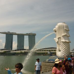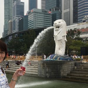 その後マーライオン公園へ船で移動。有名なマーライオン噴水前で記念写真