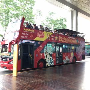 各ホテルにて貸切バスでピックアップ。途中でオープントップバスに乗り換え、赤のラインに沿って移動します。このときイヤホンをもらえるので、日本語を始め各国語の案内を利きながら巡ります。