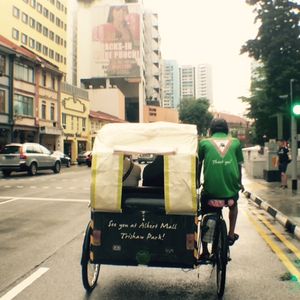 二階建てバスやトライショー、クルージングなど様々な乗り物に乗る事が出来ます。トライショーは雨の中でしたが、雨除けもついているので安心です。