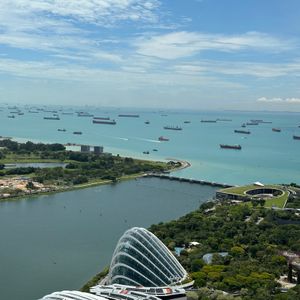 マリーナベイ・サンズの屋上から、海に浮かぶタンカー、ラッフルズホテル、マーライオンなど、シンガポールを一望できます。