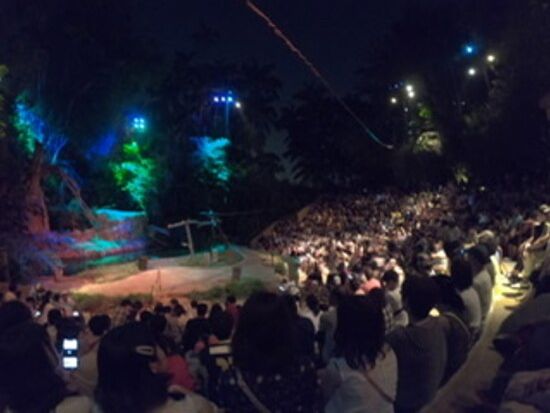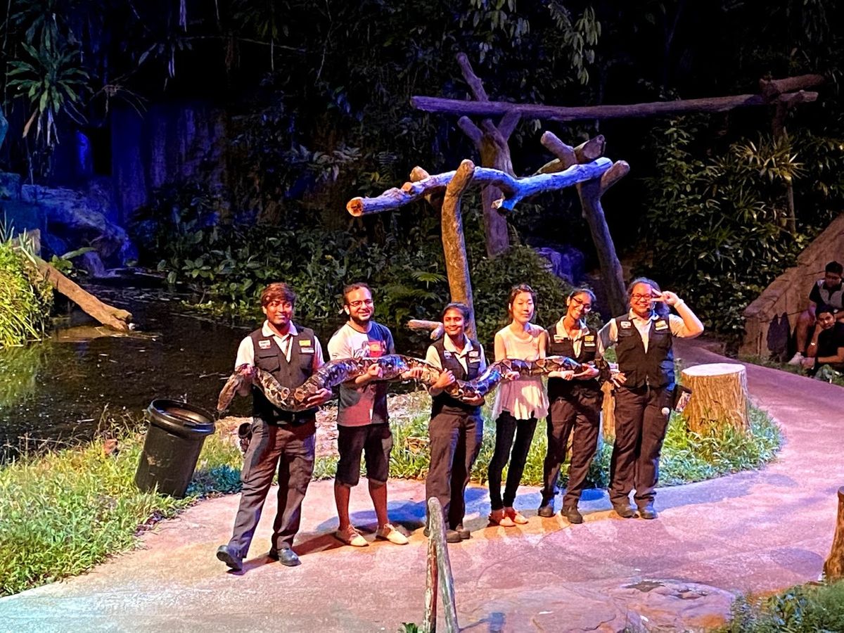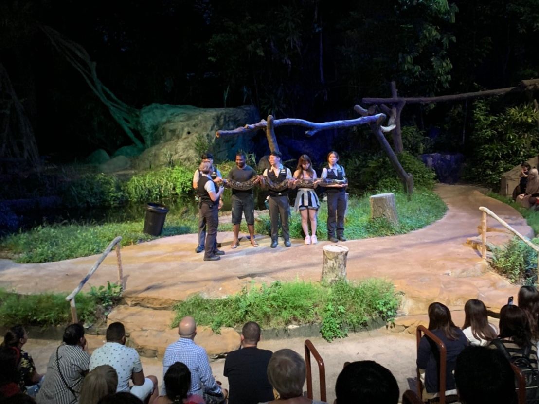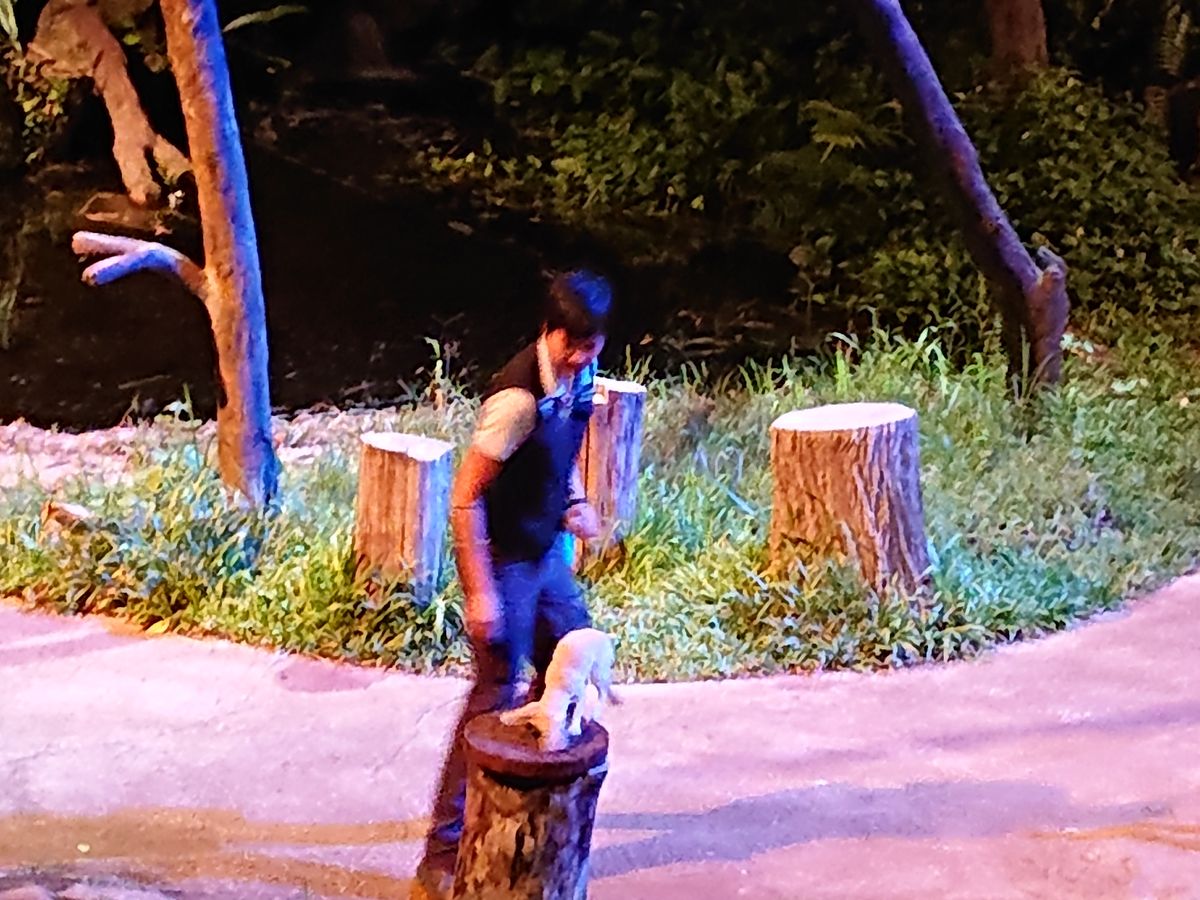夕食後ナイトサファリに移動してまずはショーを見ました!アライグマやフクロウなどが出てきてとても楽しめました。さらになんとショーの演出で助けてくれる人を探していて手をあげたら選ばれてステージ上へ!!!