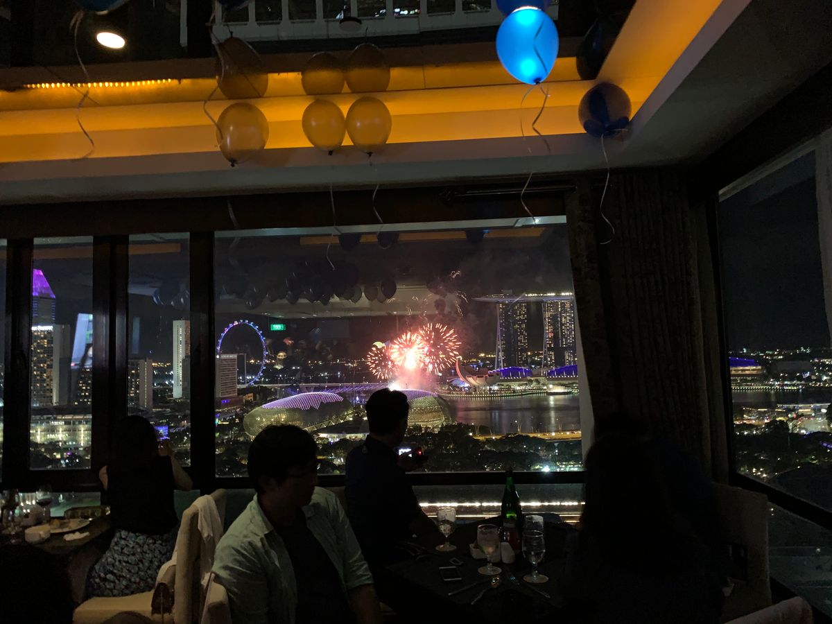 スカイラウンジの窓からはベイサンズや観覧車が見え花火が上がるとそれも見えますが、席によっては見えにくいところもあるかもしれません。