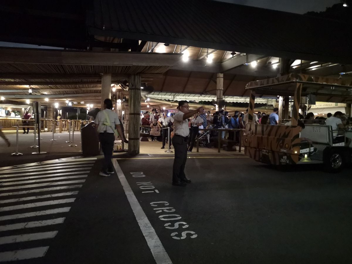 ベルトラ提供のナイトサファリのチケットは種類が多く、先ず、どれにするか悩みました。我々はシニアの夫婦で英語はそこそこしかできず、3泊4日のシンガポールを効率よく、かつシニア向けのゆるいスケジュールで、と矛盾だらけのニーズ。結局、19時45分の日本語トラムの指定だけ、という選択でした。予定では19時に動物園に着き、バウチャーをチケットに交換してその辺を回る…つもりでしたが、とんでもない事に。ここの体験談を読み漁り、コピーまでして臨みました。戦略は地下鉄+タクシー。できるだけ地下鉄で近づき、乗換駅でもあるBishanならタクシーがあると思いここで下車。バッチリタクシーに乗ったは良いが逆方向。Uターンするにも道路は帰宅時間と重なり大渋滞。どうにかUターンして高速に乗ったがここも6車線の道路が大渋滞。時間は既に7時15分。四苦八苦して動物園前に滑り込んだのは7時41分。少し前から私はトラム乗車をあきらめてました(-_-;)。家内が走り始めたのでつられて私もゲートらしいところに向け走り、改札のお姉さんにバウチャーを振りかざして”どこだ!”と叫んだらアッチだと。体験談の通り数字を打ち込むもエラーに。QRコードをかざしたらすんなりチケットが出てきました。戻って改札に突入したら、違う、アッチだ!そういえば体験談に書いてあったのを思い出しタクシーを降りた場所の向かい側めがけて走り始めたのはもう7時44分。改札口でトルム5と連呼したら暗い道の方を指さされ、最後のダッシュ。3両連結のトラムの1組目は既に動き出していました。どうにか2組目の空席に滑り込みました。教訓!平日のこの時間帯は中心部から外側に向けては道路が大渋滞になるので倍以上の余裕を持つこと。地下鉄Khatibでタクシーが掴まるならここまで地下鉄で行った方が良いでしょうね。苦労の甲斐あってトラムから動物は良く見えました。この時間帯はどうやら餌やりの頃らしく、どの動物もトラム沿いの餌場に出てきていました。下車後、トレイルを1時間ほど歩いて回り、疲れましたが他では経験できないので、とても充実感がありました。夜の9時過ぎですが欧米人のファミリーには5~6歳の子連れもいました。帰りはタクシーを降りたところにある”City Transfer”という看板のデスクにKhatib行き・市内ホテル1?・市内ホテル2?みたいに方面別のチケットを売っていて、私たちはホテルがクラークキーなので、ここでもクラーク・キーと叫んで一人6ドル払って指示されたバスに乗りました。定員の半分くらいで出発しまし、途中チャイナタウンとかいろいろ回るので1時間はかかります。ここの体験談を読んでいなかったら私達は絶対トラムに間に合わなかったと思います。感謝!それにしてもナイトサファリの発券場所をナイトサファリ側に作れないのでしょうか。(私が気づかなかったのかな?)2019年9月2日(月)のことです。