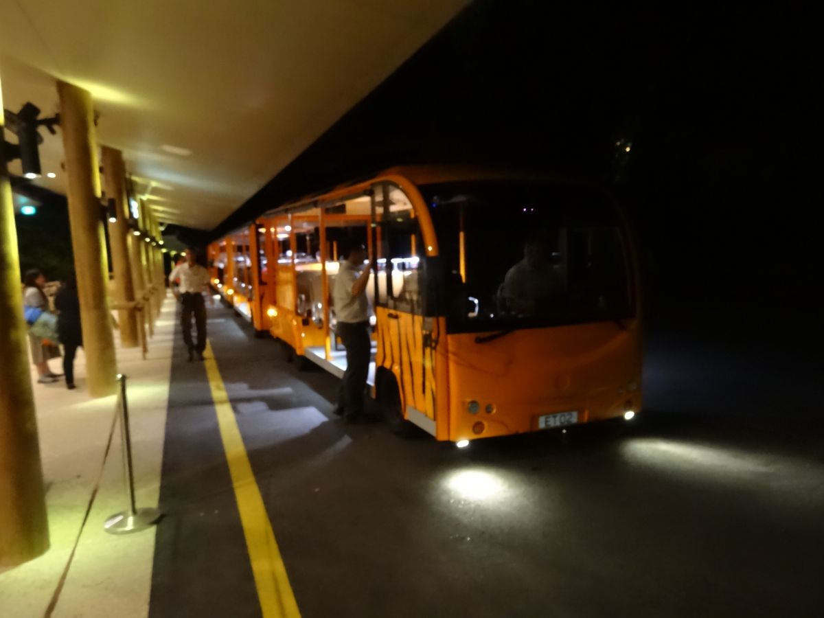 トラムに乗って、動物園内を移動。夜なので、日も暮れて暑くもなく爽快。直ぐそばに、動物かいて、暗い中でびっくり!! 感動しました。
