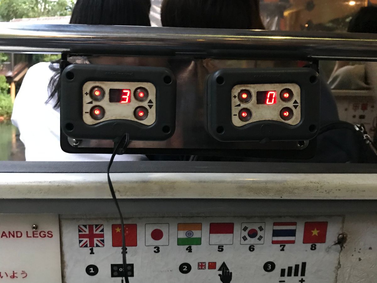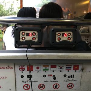 8年ぶりのナイトサファリ。以前は日本語の解説がスピーカーで流れるタイプでしたが、いまはイヤホンが配られて日本語解説を聴くタイプでした。イヤホンは座席の前のコントローラーに差し込んで日本語を選びます。