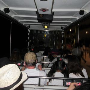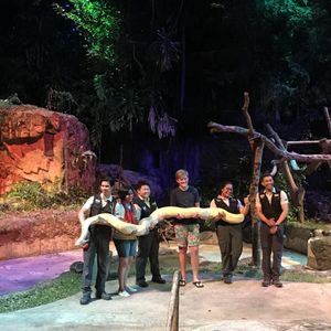 滞在ホテルのロビーに添乗員さんがお迎えに来てくれます。1時間弱で到着し一度解散となり、再集合の時間を伝えられます。17:30に開門しチケット売り場やお土産屋さんの広場に入れます。我が家は夕食なしのため、そこで簡単な食事をして時間を待ちます。再集合の時間に言われた場所に集合し、添乗員さんの誘導のもと、エクスプレストラムに乗り込みます。イヤホンをもらいチャンネル3に合わせると日本語の説明が聞けます。イヤホンは聞こえ無ければ変えてもらえますので必ず確認しましょう。トラムに乗り出発、薄暗いので目を凝らしますが、見えた動物といるかいないかもわからない動物とありましたので☆-1 でも暗闇の中で響く鳴き声はワクワクします。アニマルショーは口コミにあったように、日本のショーと比べ物にならないほど、ちょっとちょっとですが、それなりに面白いです。でも英語が解らないと面白さも半減かな。