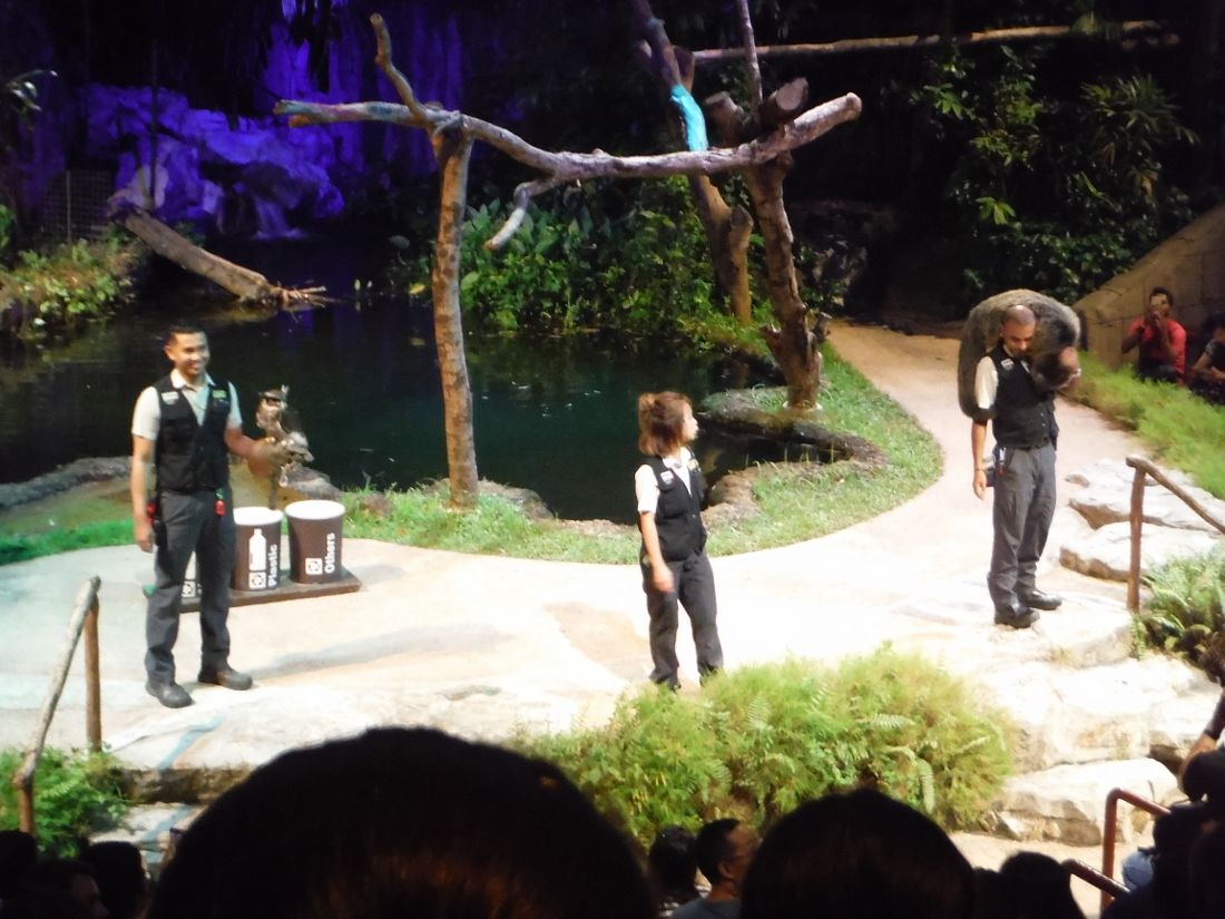 再集合してトレイルを歩きながら動物を観察、その後は動物のショーか他のトレイルを各自散策を選び、お待ちかねのトラム乗車です。ツアーのいい所はあまり待たなくて良い所でしょうか。トラムは日本語のチャンネルがあるのでヘッドホンをつけての乗車です。フラッシュは使えないのでなかなかいい写真は難しいと思いますので目で楽しんでください。帰りは15分ぐらい自由時間があるので入口付近で行われるファイヤーショーが見られます。