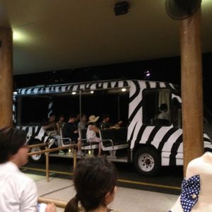 動物園についたのはまだ明るい5時半頃でした。早速夕食をいただきました。お肉や野菜、果物、飲み物等種類も多くどれも美味しかったです。その後トラムの乗り場へ、土曜日の夜ということもあってか、すごい人が並んでいました、でも私たちは予約者いうことで、並ばずに乗せてもらいました。一人ずつイヤホーンが付いていて、日本語での案内を聞きながら右を向いたり、左を向いたり、暗くなってきたジャングルの中に、動物の姿を見つけることができる程度の明るさの中、自然な様子のライオン、シマウマ、キリンなどなどを見ることができました。ワクワク、ドキドキの時間でした。