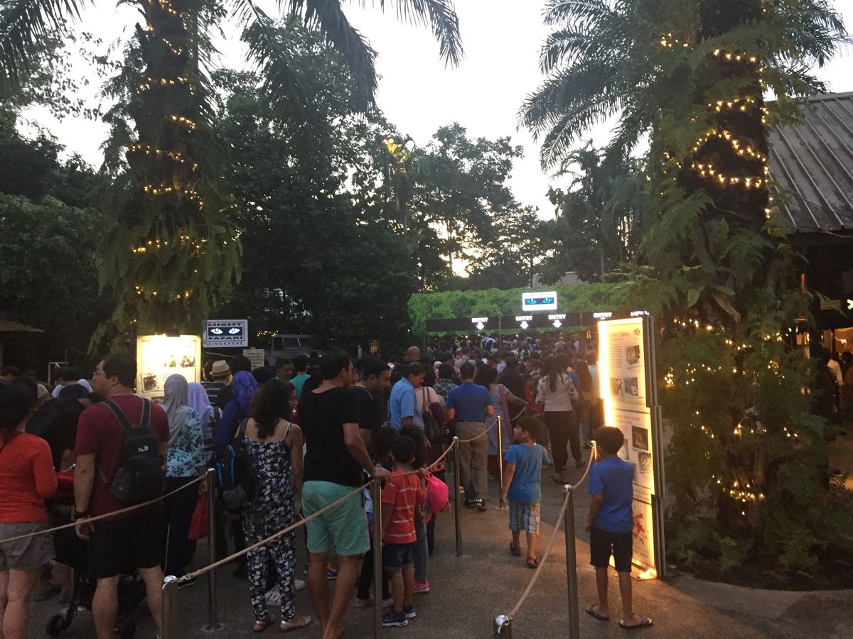 最も行ってみたかったナイトサファリですが、あちこちサイトを見ると入場とトラム乗車ですごく混むという書き込みがたくさんあり少々不安になったので、バリ観光でお世話になったVELTRA社のツアーを申し込みました。結果、シンガポール動物園は歩きなので少々ばてたけれど、ナイトサファリはトラム乗車なので楽に楽しめました。夜の動物の生態はとても興味深く面白かったです。何といっても列に並ぶことがほとんどないのが良かった。ツアーで申し込んで大正解。入口やトラム乗車はチョー大群衆が並んでいて唖然としました。