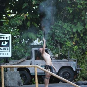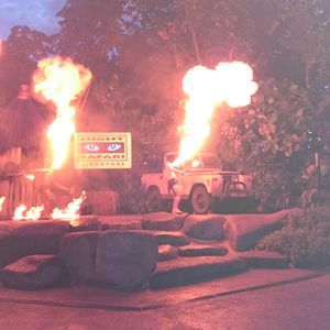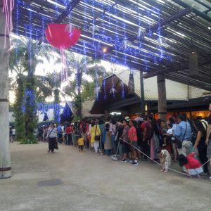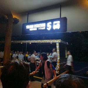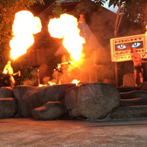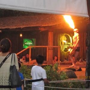 ホテルから到着後に食事有りの方はビッフェに行きます。トラムに並ぶ方が大勢いますが時間予約されているため、夕食なしの方はその時間まで自由になります。私たちは、園内にあるファストフードで軽食をとりながら、テーブルからファイヤーダンスを見てました。その後、お土産店で購入し、トラムに向かいます。