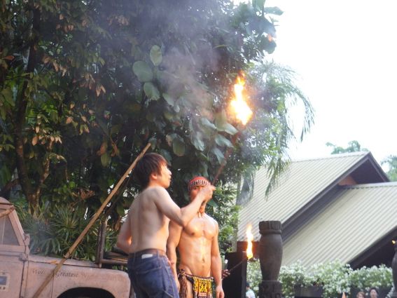 到着した後、まずは夕食時間になるのですが、夕食無しの参加者は自由時間となります。その間にファイヤーショーがあって、これが迫力満点でとっても面白かったです。到着したらすぐ、ハンバーカーレストランの席を確保しましょう!