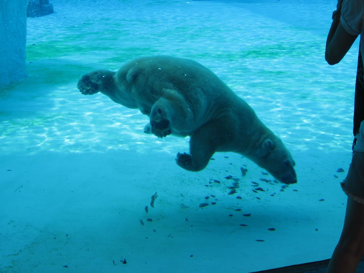 適宜自由時間を取ってもらえて、私たちはオランウータン(園内ほぼ中央)そばの白クマ館(日本のタヌキもいます)で休憩してました。(冷房がすごく利いています)