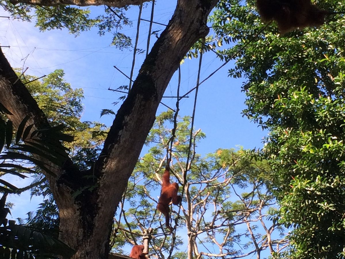 ガイドさんが説明してくれながら一緒に回って、園内のトラムにも乗りました。その後はオランウータンと朝食の会場から自由にロープや木を伝って帰るオランウータン達を見ました。基本、危険ではない動物は放し飼い状態で、それ以外はお堀越しに動物を見ます。