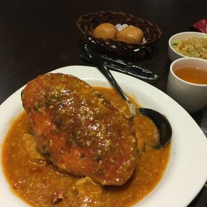 大鍋で出てきたメインのチリクラブは、他の口コミ同様、食べる部分は少なかったですが、味は美味しかったし、チリソースがふんだんにあり、〆のチャーハンのボリュームで結果的にお腹いっぱいになりました。同時にサーブされた揚げパンも絶品でした。