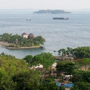 1月25日に参加した。旧正月の前日であり、セントーサ島ではフラワーフェステイバルが行われており、とても大勢の人でした。マーライオンの像のてっぺんまで上ると、シンガポールの町が一望できました。(近いうちに、ユニバーサルスタジオやカジノができるとの事で、工事中の所を望めましたが、完成したら訪れてみたいものです。)早目の夕食の後、ガイドさんの機転で、並ぶ時間もそれほど長くなく、音と光のショーを見ることができました。ストーリー仕立てで、噴水に光を当てたり、水のスクリーンに絵が浮かんだり、花火と音楽でとても楽しむ事ができました。
