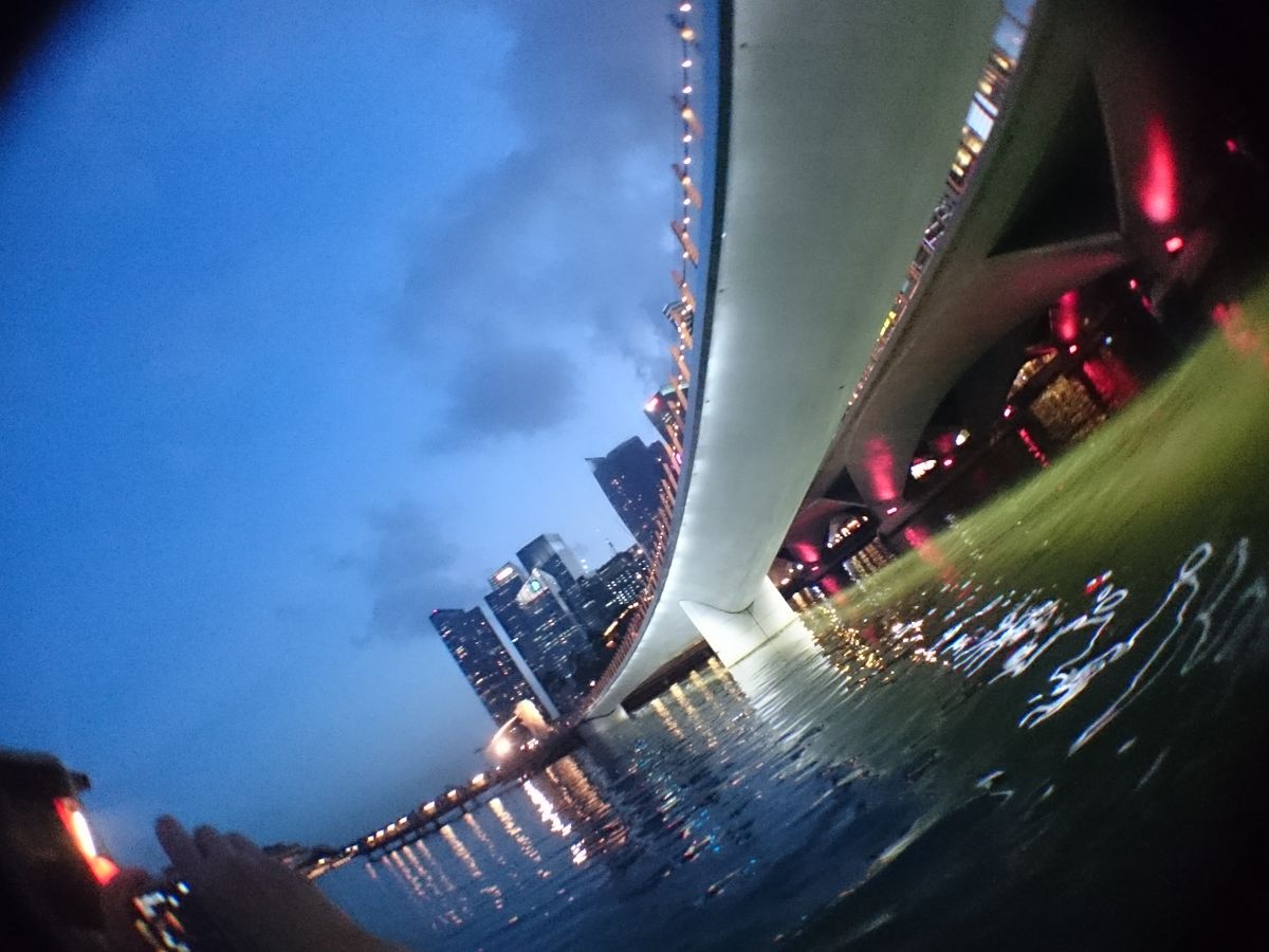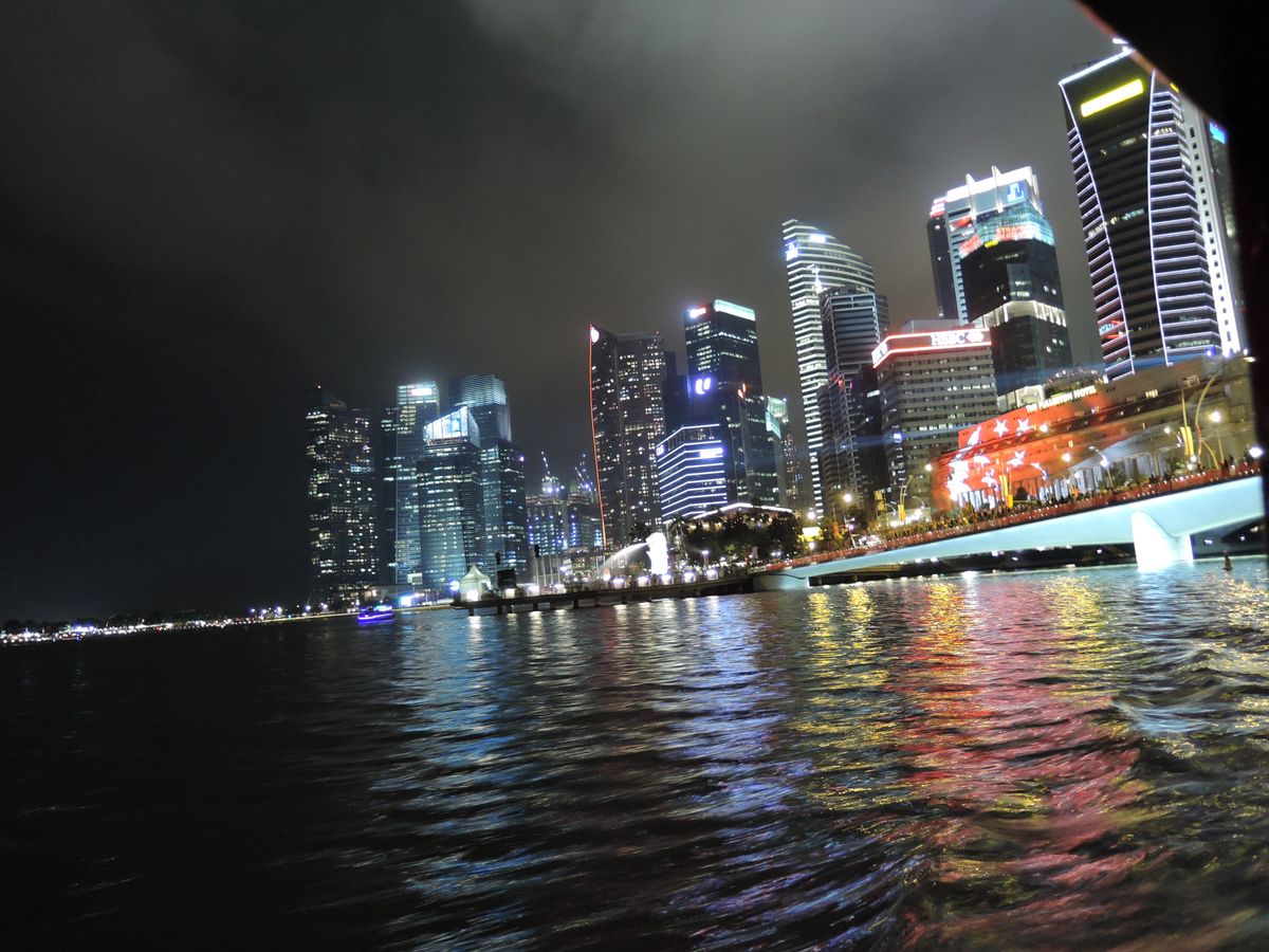我々夫婦以外にもう一組のご夫婦と1人で参加されている方の三組5名でのツアーがスタートしました。最初に、中華のディナーですが、これはまずくはないですが、格別美味しいとういうほどのものでもありませんでした。食事後、50周年の花火を見る為に、ベイのすぐ傍まで移動して、大混雑の中での鑑賞。その後は、定番のワンダフルショーと続き、堪能しました。実はこの日は川が閉鎖されていて、リバークルーズは無理という事を最初に言われていた為に、これで終わりかと思うといささか不完全性定理燃焼でした。ところが、帰りがけにガイドの方が、リバークルーズが動くので、乗りましょうと言って頂き無事に乗る事が出来ました。
