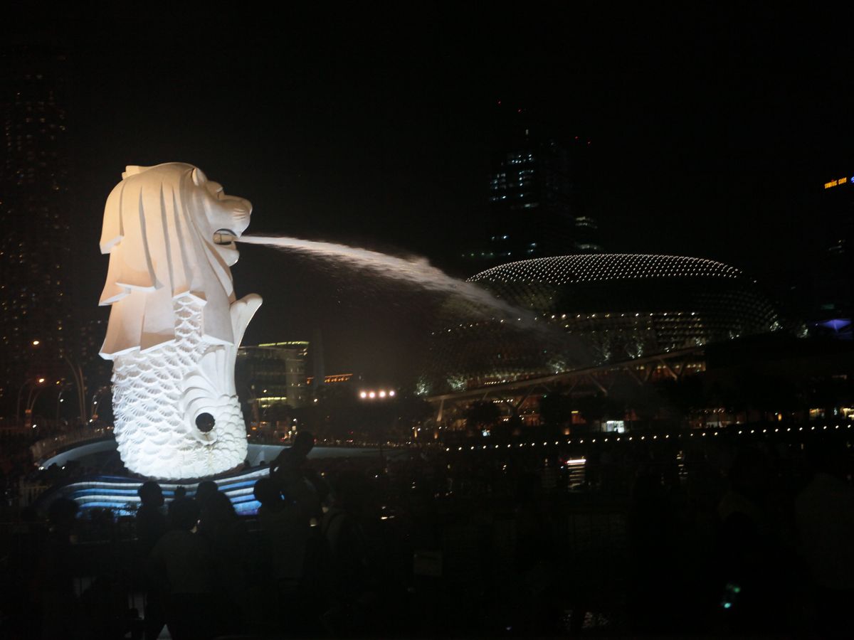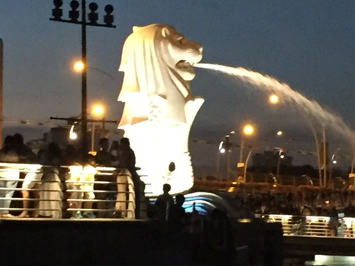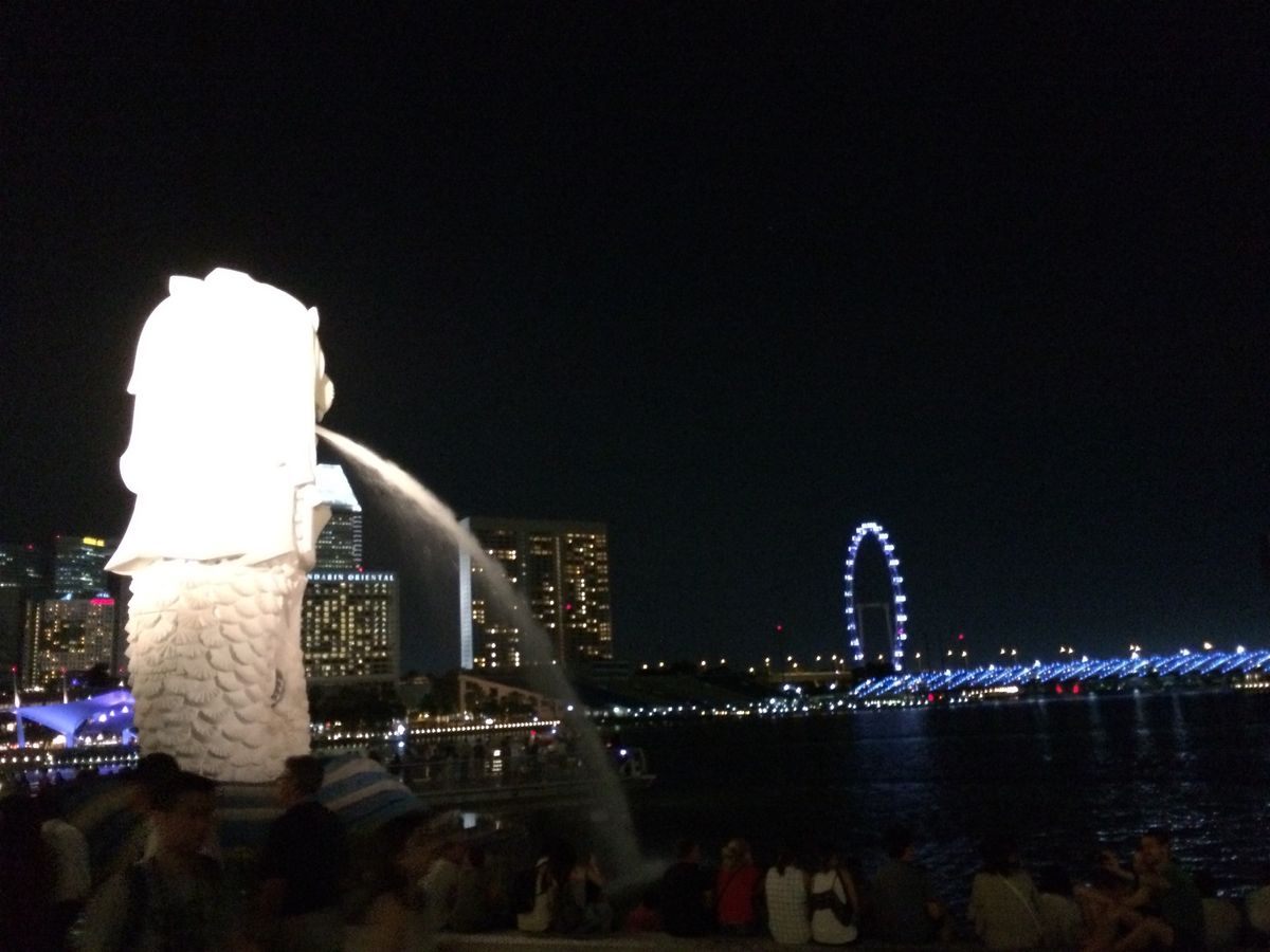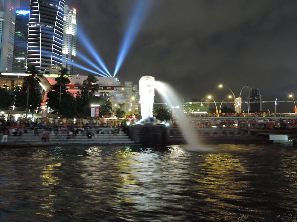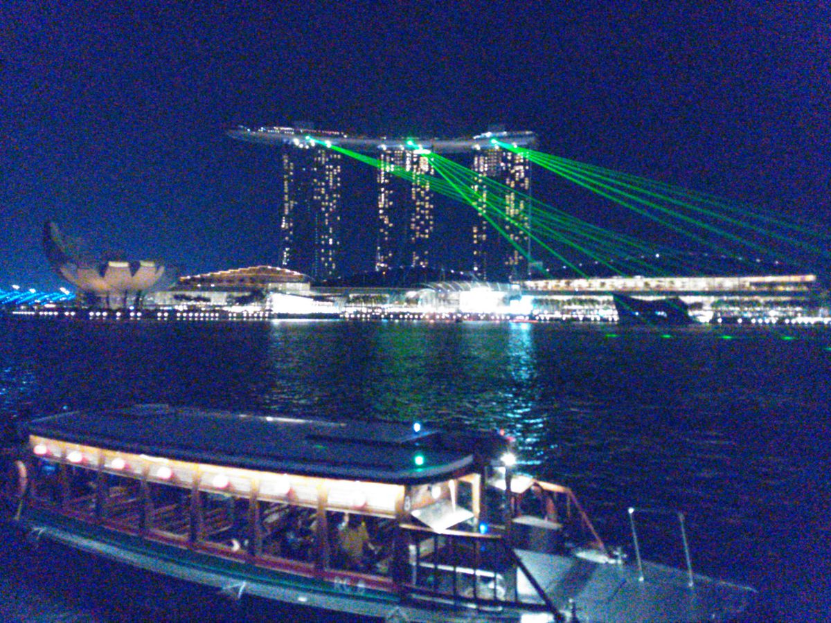 その後クラークキーから船でマーライオンパークへ。そこからマリーナベイサンズからの光のショーを見ます。音がほぼ聞こえない中で光だけが動くので、