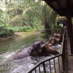 オラウータンと食事がしたくてこのツアーにしました。一番前で、とはいきませんでしたが、一緒に写真を撮ることができました。リバーサファリでのクルーズはお昼頃でしたが誰もいなくて、二人だけの貸し切りでした。