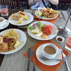夫婦2人で参加。ツアーには親子連れ3人とカップルの3組でした。朝食は普通、席はオランウータンのすく前の席ではなく、前方だが離れてました。この日は地元低学年が参加していて席は満席、観光客も大勢いました。記念写真に並んでオランウータンとパチリ!こんな感じなのと思いも、子連れオランウータンはとても可愛いく見入ってしまいます。レストランの外に沢山オランウータン居ますので近くで見なくても良いなら、外でじっくり観察するのも、とても楽しいですよ。