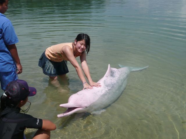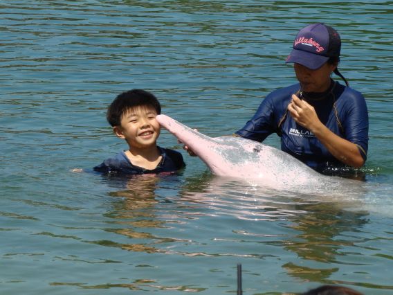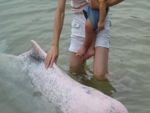 本当に珍しいピンクイルカを触って、記念写真も撮ってもらいました!