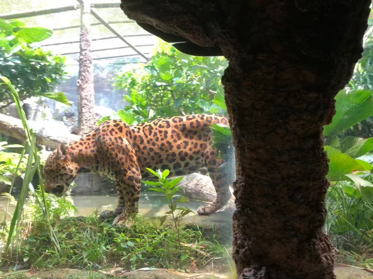 3種類のチケットを手渡され、1枚目は、シンガポール動物園入場券、2枚目は、リバーサファリの入場券、3枚目は、リバーサファリの中のクルーズの券でした。このチケットはどれも、似た絵なので取り間違えない様にとの注意を受けました。本当に、どれがどれかわからないぐらい似たチケットでした。まずシンガポール動物園から入場しました。途中までは、屋根付きの通路でしたが、激しい雨の中、屋根無しになり、あっと言う間にずぶ濡れでした。それでも、像の餌やり時間に間に合う様に雨の中を急いで行くと、残念な事に雨がひどかったせいか餌やり時間を早めに終了しており、餌やり後の水浴びからの像さん達とのご対面になりました。私達は、水浴びをした訳でもないのに、像さん達と同じ様に濡れまくり状態でした。身近に見る像の大きさ、そして、自然に住んでいる感を感じるほどのびのび数頭の像達が戯れており、木の上から下げてある大きなタイヤと遊んでいました。その後、他の動物探しをしましたが、動物でさえ、雨を避けての避難をしていて、最初は動物達を思うほど見ることができませんでした。餌やりの時間はきちんと時間通りと言うわけでは、なさそうです。お陰で、カワウソの餌やりには、遭遇ができました。それから、ガイドさんお勧めの爬虫類館へ向かい、その途中で、お世話の行き届いた施設の中の動物達と遭遇………、チーターやヒョウや、リカオンなどがガラス越しに直ぐ横に居て、まるでペットショップのガラスの向こうのワンちゃん達の様でした。立ち上がる姿や、頭を上げたりする姿をこんな目の前で見れるなんてすごいと感動しました。