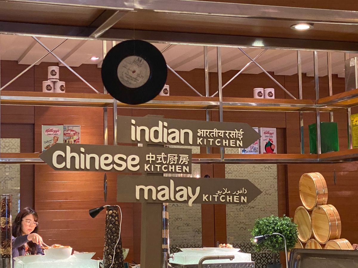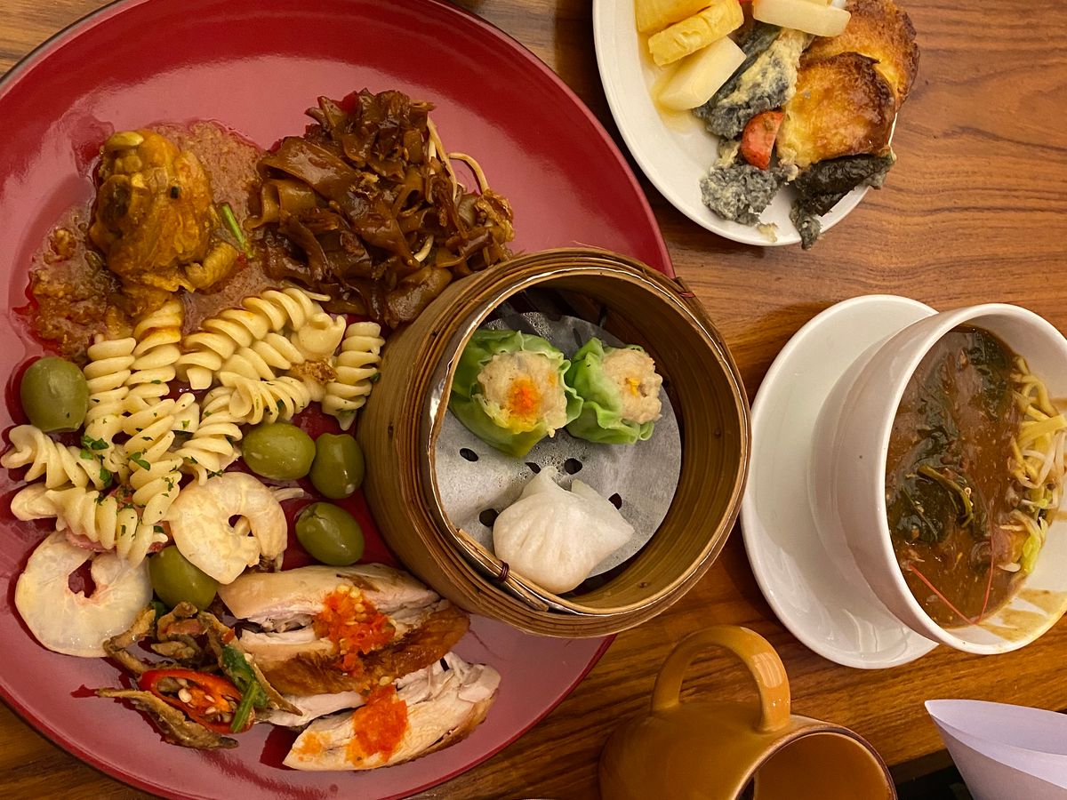 食事は、ヒルトンのブッフェ。 前回は水上レストランでの純粋なマレー料理。