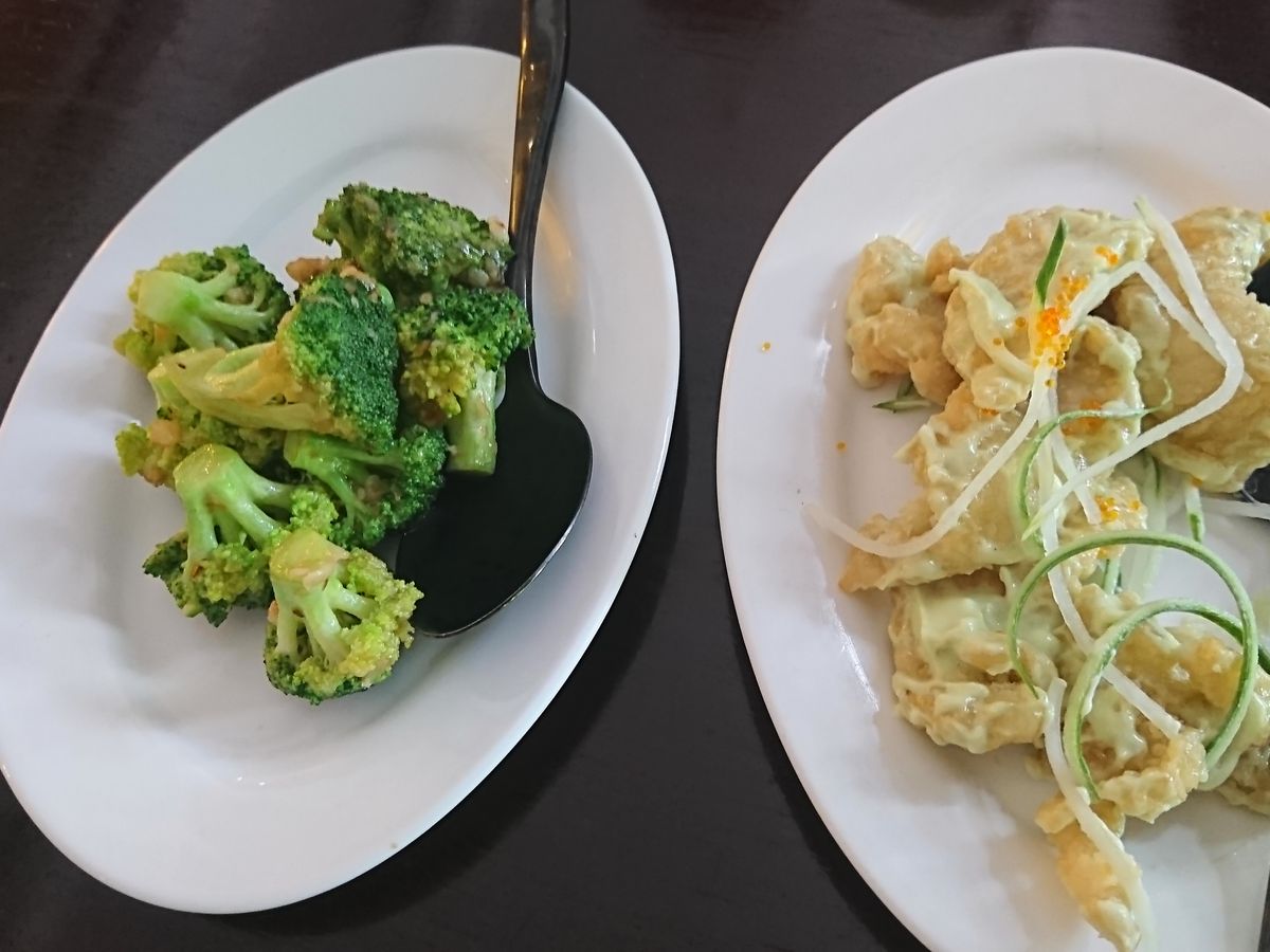 料理の内容は、海老唐揚げ、白身魚のフリッター、ブロッコリー、チリクラブと揚げパン、炒飯、甘もの