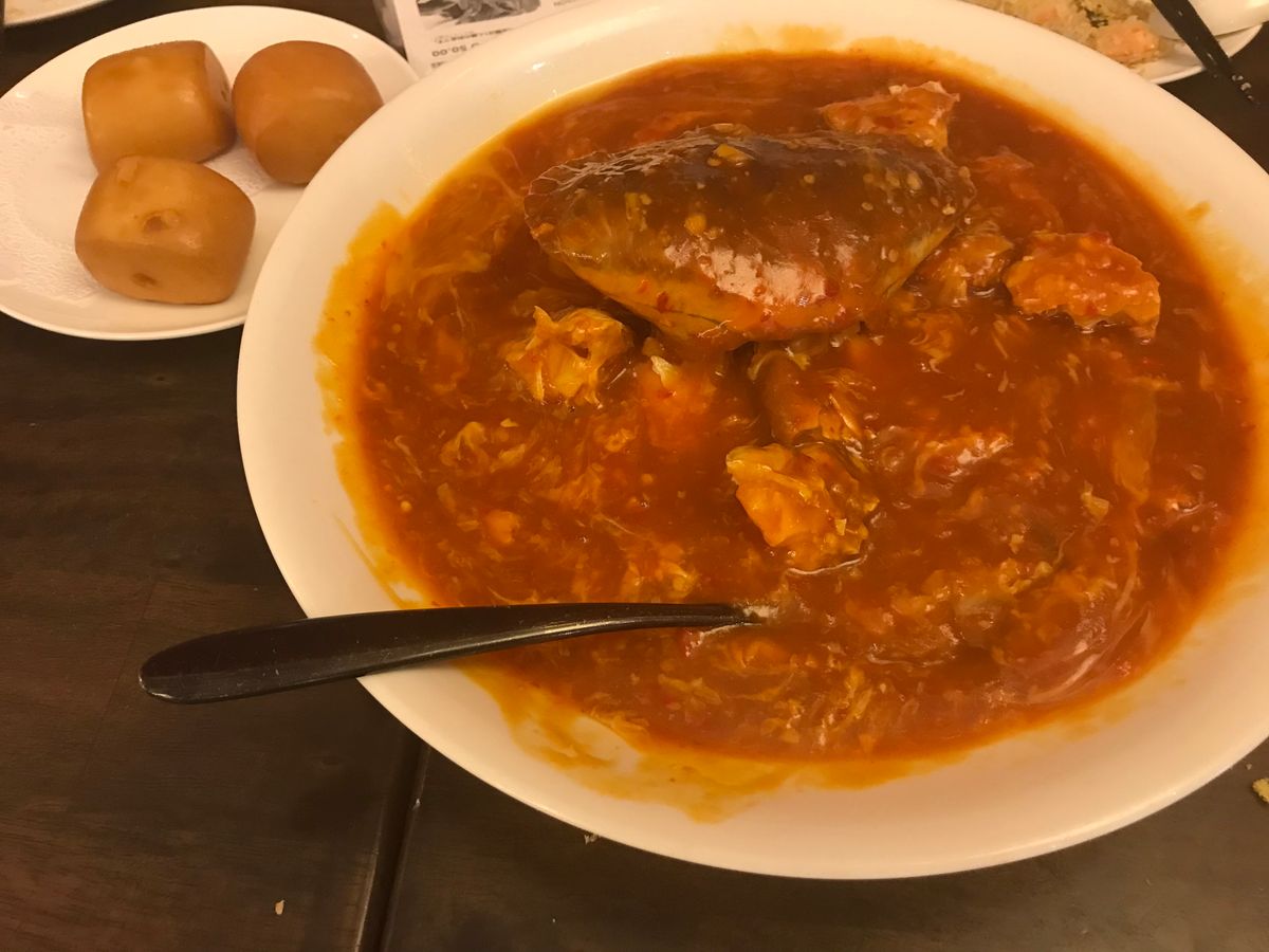 大鍋で出てきたメインのチリクラブは、他の口コミ同様、食べる部分は少なかったですが、味は美味しかったし、チリソースがふんだんにあり、〆のチャーハンのボリュームで結果的にお腹いっぱいになりました。同時にサーブされた揚げパンも絶品でした。
