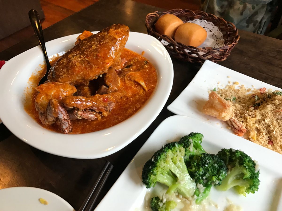 今回は前回食べさせてあげられる機会が無かったチリクラブを母に1度は食べさせてあげたいと予約しました。チリクラブは辛すぎず年配の方でも食べやすいお味でした。母も美味しいと満足の様子でした。二人で丁度良い量でしたし。他のお料理も普通に美味しかったです。お店の方も親切でしたし、利用して良かったと思います。帰りのタクシーもお店の方にお願いした所、丁寧な対応で手配して頂けました。徒歩圏内にパイナップルケーキの美味しいエルイー・カフェのお店が有るのも便利でした。