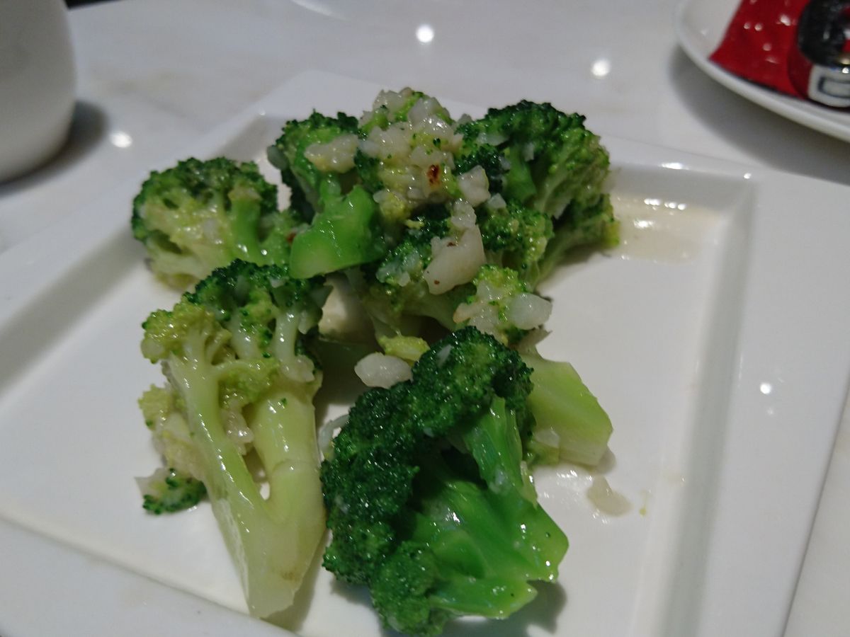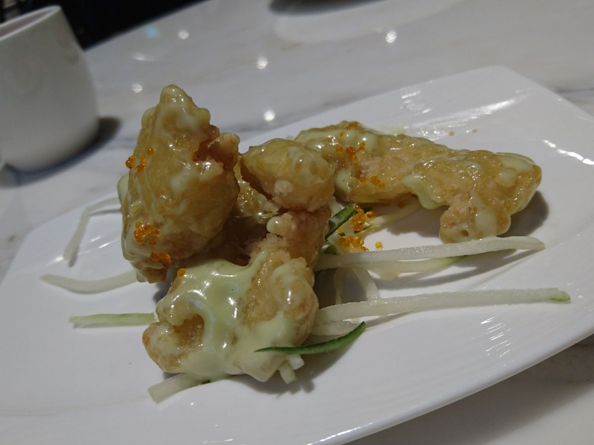 予約時間より20分早く到着しましたがヴァウチャーを提示すると直ぐ席に通され紙エプロン、ウエットティッシュが出てきてエビのピーナツ揚げ、白身魚のわさびマヨのソテーとブロッコリーのニンニク炒めが一度に運ばれてきました。