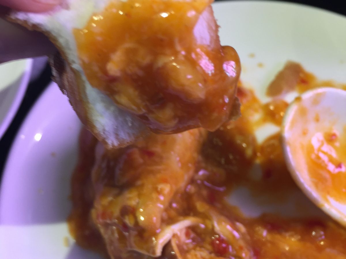 その後ウォーターボールとクラブクラッカー1個(蟹割り)とメインのチリクラブと揚げパンが運ばれ、持参したビニール手袋をして甲羅の身を出しましたが殆どチリソースに出ていました。蟹みそも一緒に煮込んだソースなので少し癖がありますが初めてチリクラブを頂き納得の味で量も2人で丁度良かったです。