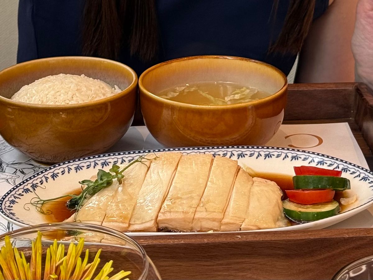 ヒルトンの5階にエレベータで行くと、案内があって、場所はわかりやすかったです。前菜、主菜、デザートとどれも美味しかったです。値段は高めと思いますが、きれいな場所で、落ち着いて食事できました。旅行での滞在中、チキンライスは何回も食べないと思いますので、ここで食べておけば間違いないのでしょう。
