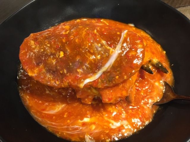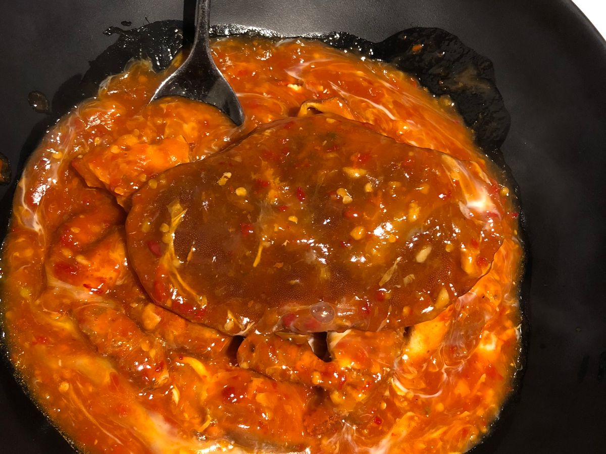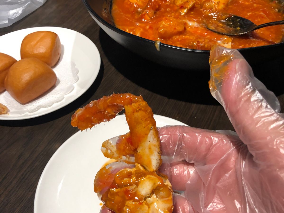 見た目はからそうですが、食べてみると甘辛く、ちょうどいい感じでした。手袋をして、悪戦苦闘しながら、カニと格闘。身を掘り出しながら、ソースと絡めて堪能しました。 汚れることは気にしないで食べるのみ